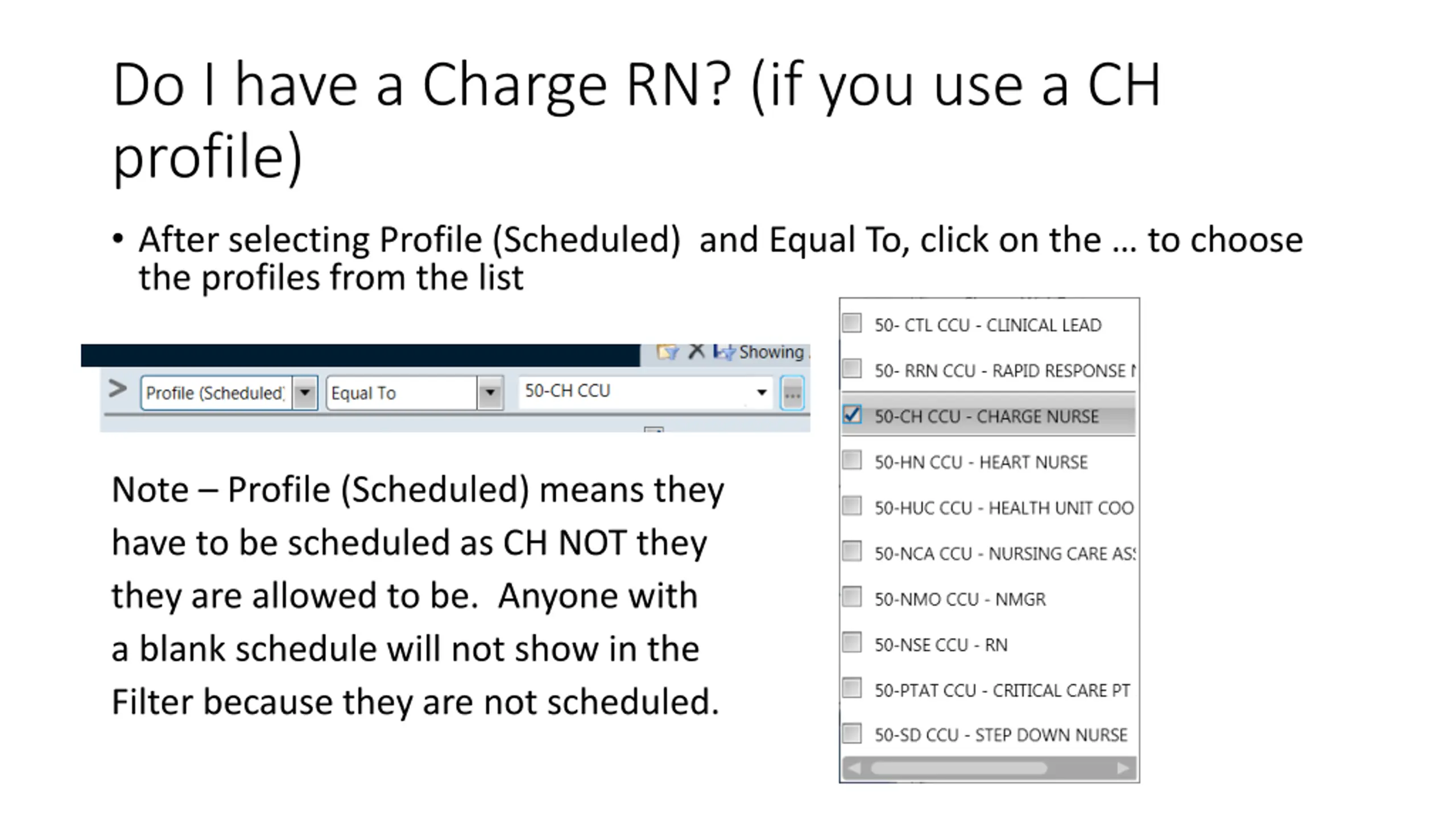 Do I have a Charge RN? (if you use a CH profile) After selecting Profile (Scheduled) and Equal To, click on the to choose the profiles from the list Note Profile (Scheduled) means they have to be scheduled as CH NOT they they are allowed to be. Anyone with a blank schedule will not show in the Filter because they are not scheduled.