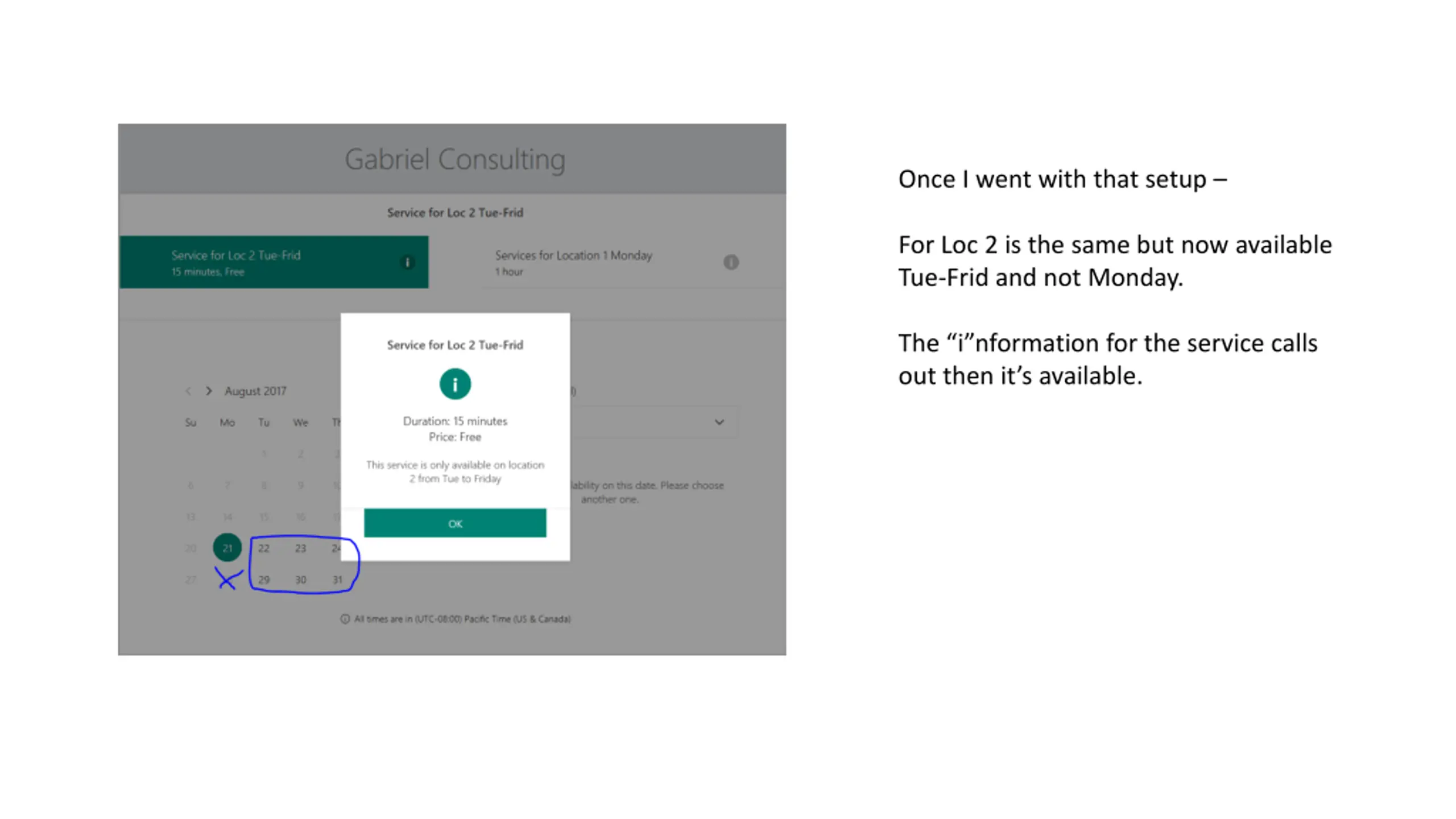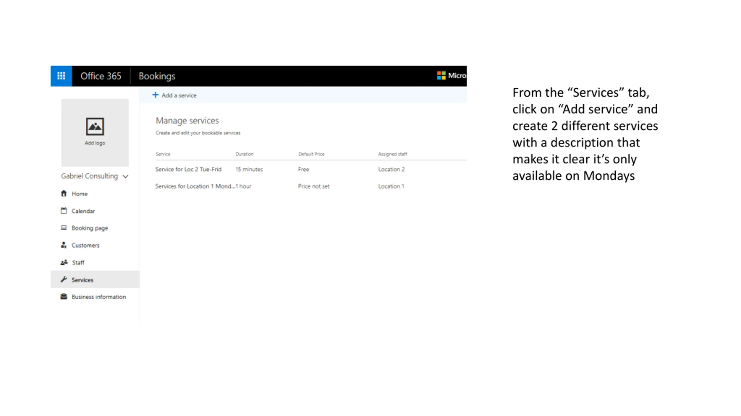 The way I would do what you need I would create a separate service for each location and create a staff member for each location This way, you can assign one staff to each service and block the staff s time for when it s not available I have created a simple demo I created 2 services each described with 2 locations I created 2 staff members with free email accounts and assigned each staff to each service (I.e. Service for Loc 2 to staff Location 2) I set up Mondays as day-off for staff Location 2 so that it can t be booked on Mondays I set up Tue-Frid as day-off for staff Location 1, so that it can only be booked on Mondays The advantage with this setup is that you can see all your Bookings in one calendar. If you create separate Bookings pages for each service, you won t be able to see all your appointments in the Bookings calendar That being said. If you create multiple Bookings calendars, with you as the admin, then all appointments that are created would go to your Office 365 calendar so that would be where you could see the big picture.