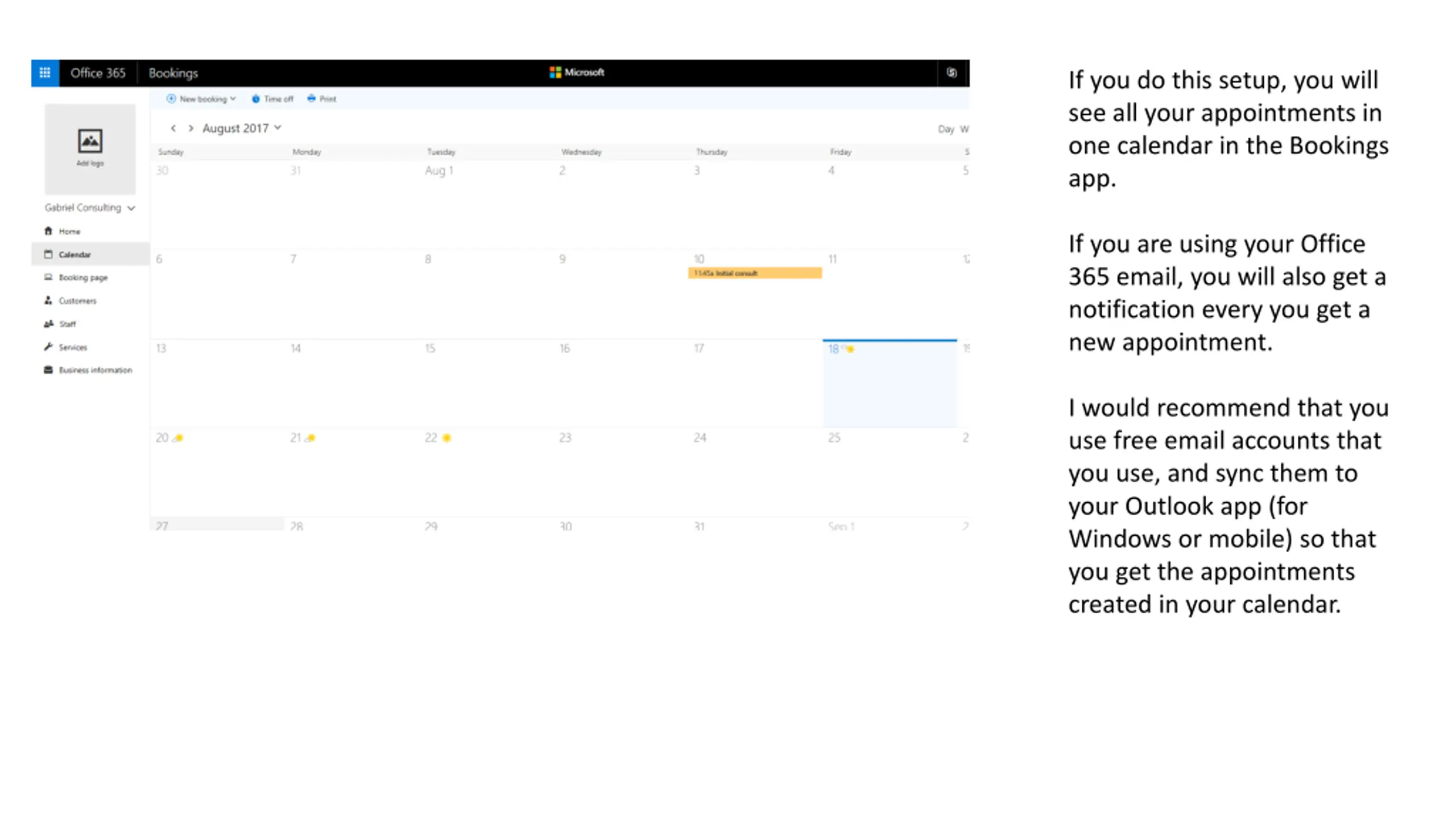 If you do this setup, you will see all your appointments in one calendar in the Bookings app. If you are using your Office 365 email, you will also get a notification every you get a new appointment. I would recommend that you use free email accounts that you use, and sync them to your Outlook app (for Windows or mobile) so that you get the appointments created in your calendar.