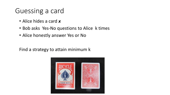 Guessing a card Alice hides a card x Bob asks Yes-No questions to Alice k times Alice honestly answer Yes or No Find a strategy to attain minimum k