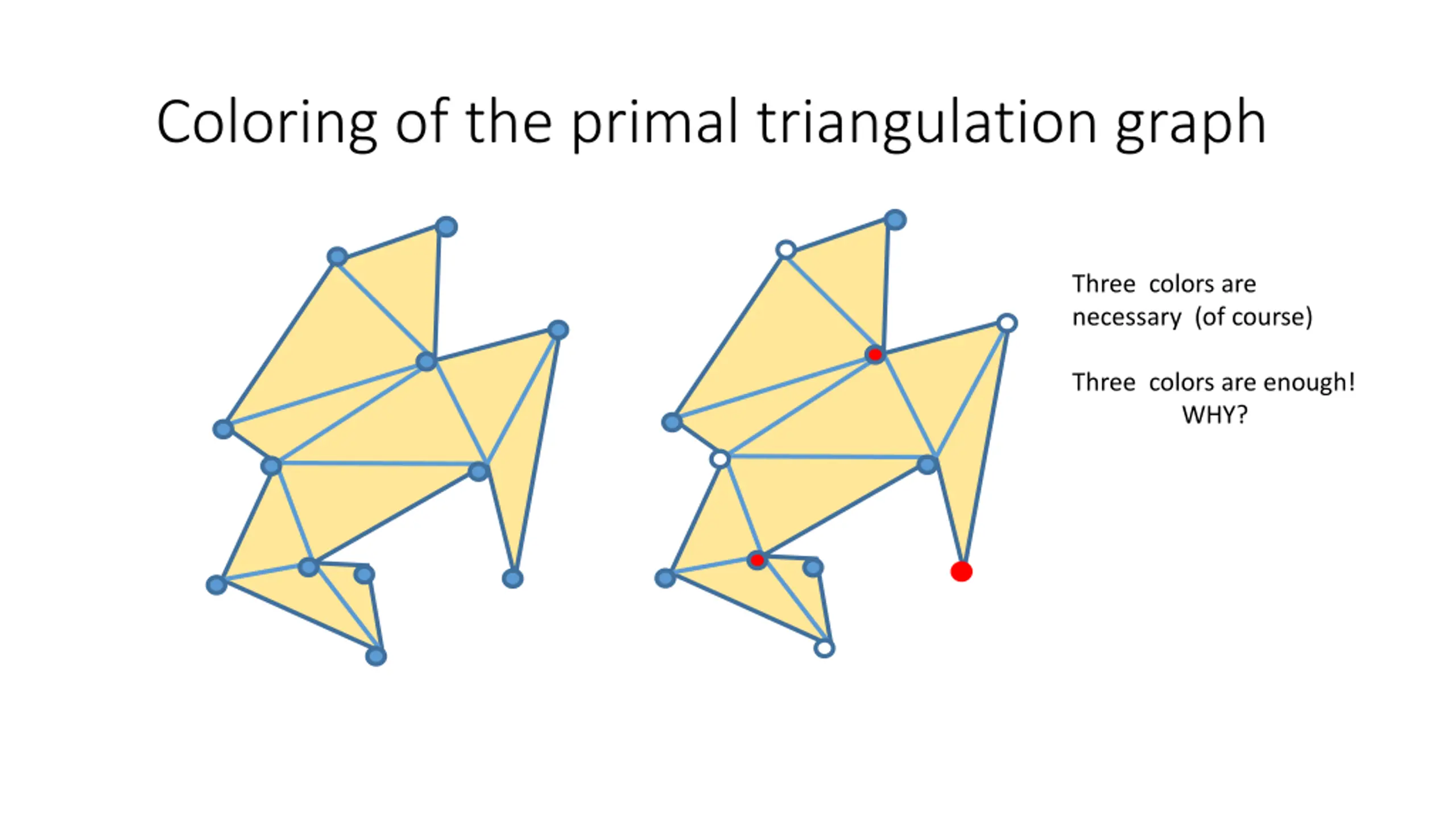 Coloring of the primal triangulation graph Three colors are necessary (of course) Three colors are enough! WHY?