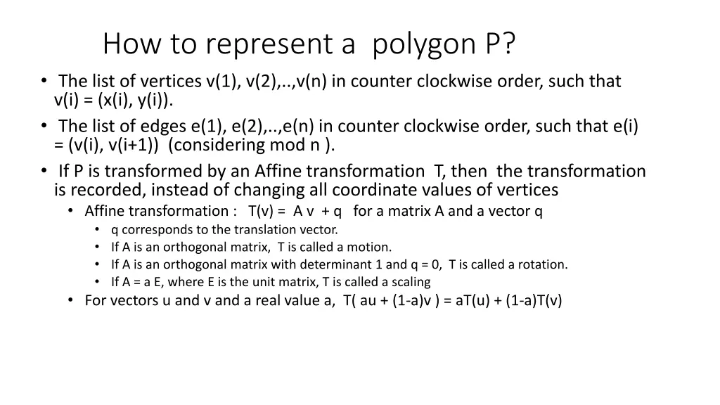 How to represent a polygon P? The list of vertices v(1), v(2),..,v(n) in counter clockwise order, such that v(i) = (x(i), y(i)). The list of edges e(1), e(2),..,e(n) in counter clockwise order, such that e(i) = (v(i), v(i+1)) (considering mod n ). If P is transformed by an Affine transformation T, then the transformation is recorded, instead of changing all coordinate values of vertices Affine transformation : T(v) = A v + q for a matrix A and a vector q q corresponds to the translation vector. If A is an orthogonal matrix, T is called a motion. If A is an orthogonal matrix with determinant 1 and q = 0, T is called a rotation. If A = a E, where E is the unit matrix, T is called a scaling For vectors u and v and a real value a, T( au + (1-a)v ) = aT(u) + (1-a)T(v)