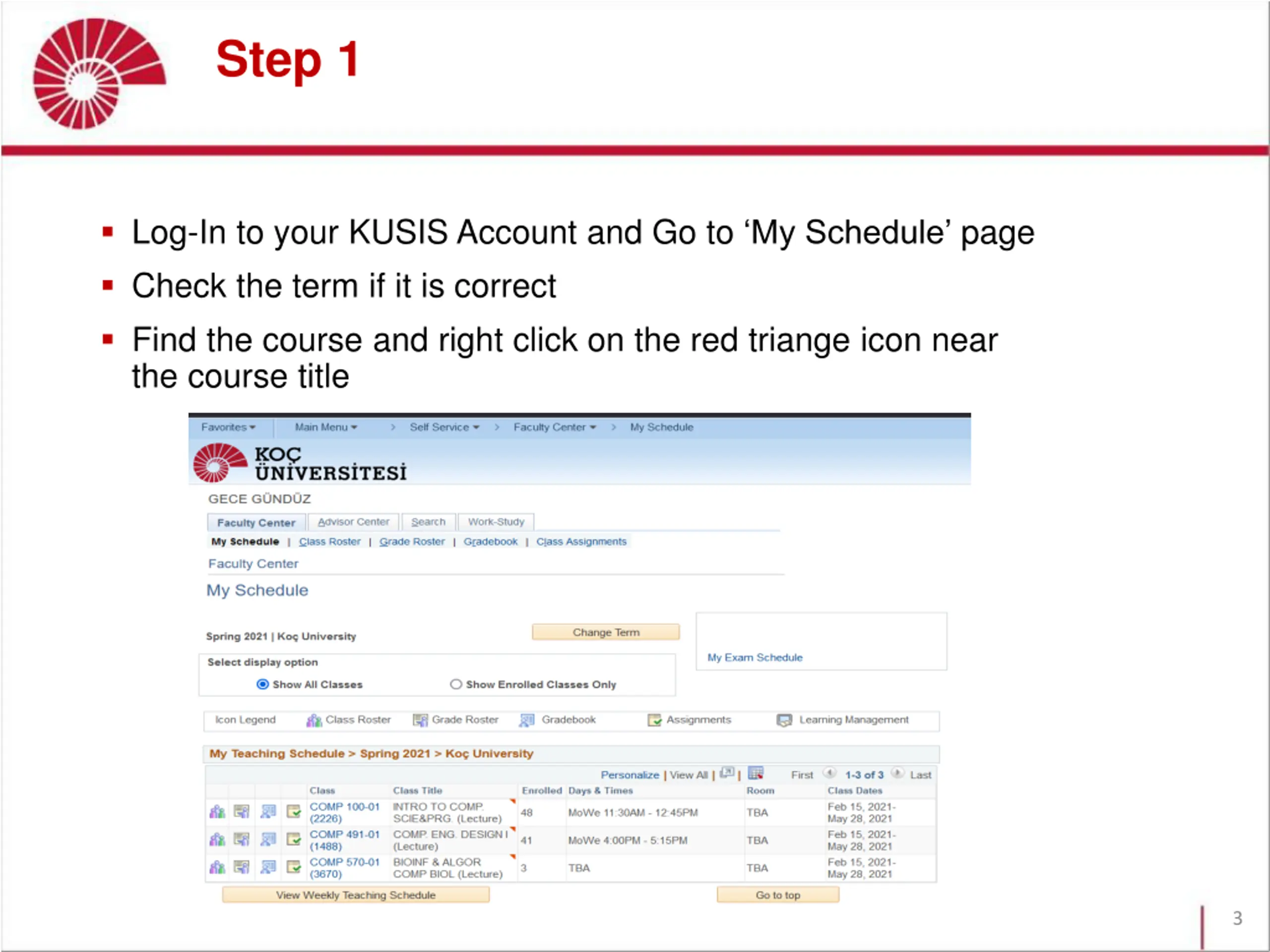 Step 1 Log-In to your KUSIS Account and Go to My Schedule page Check the term if it is correct Find the course and right click on the red triange icon near the course title 3