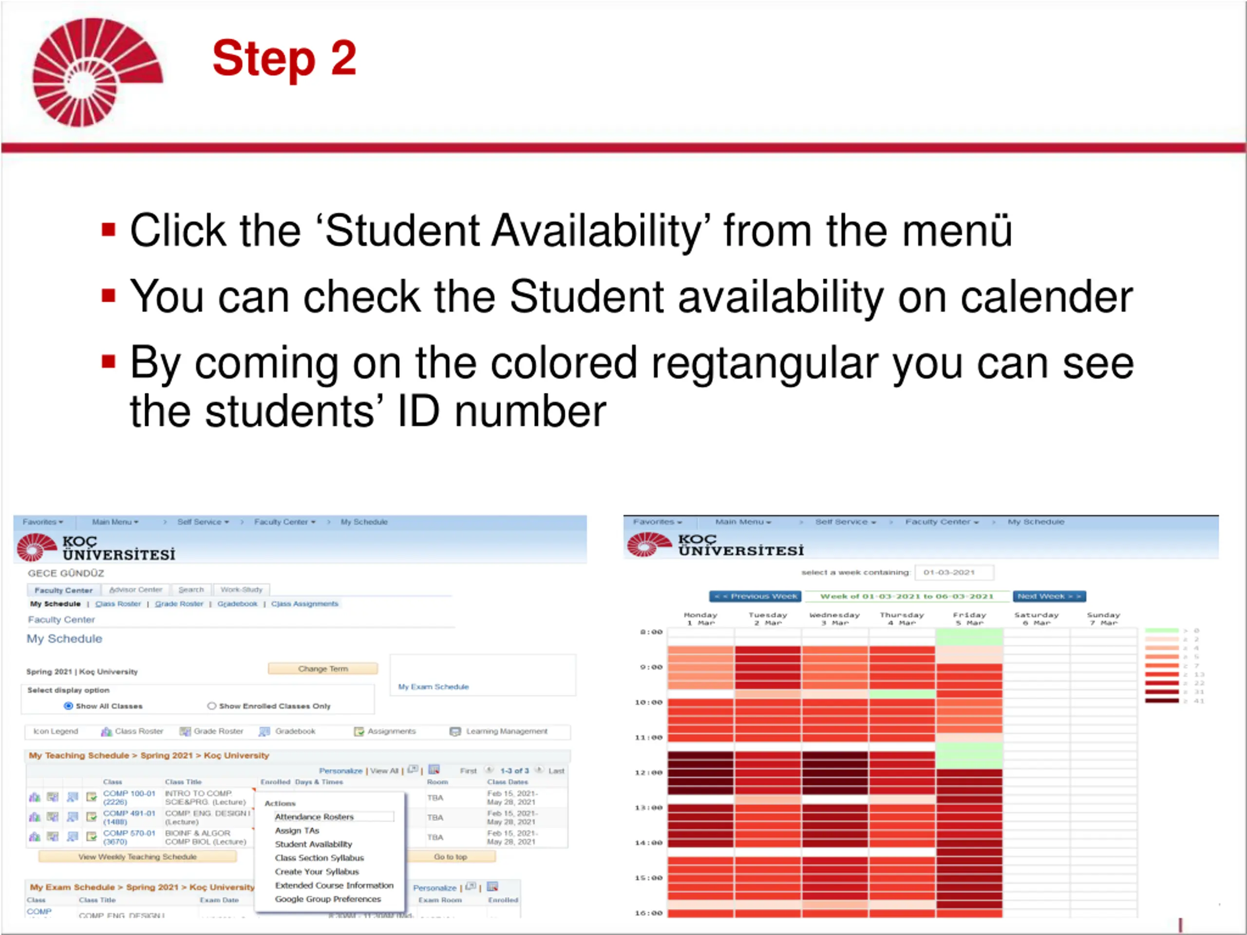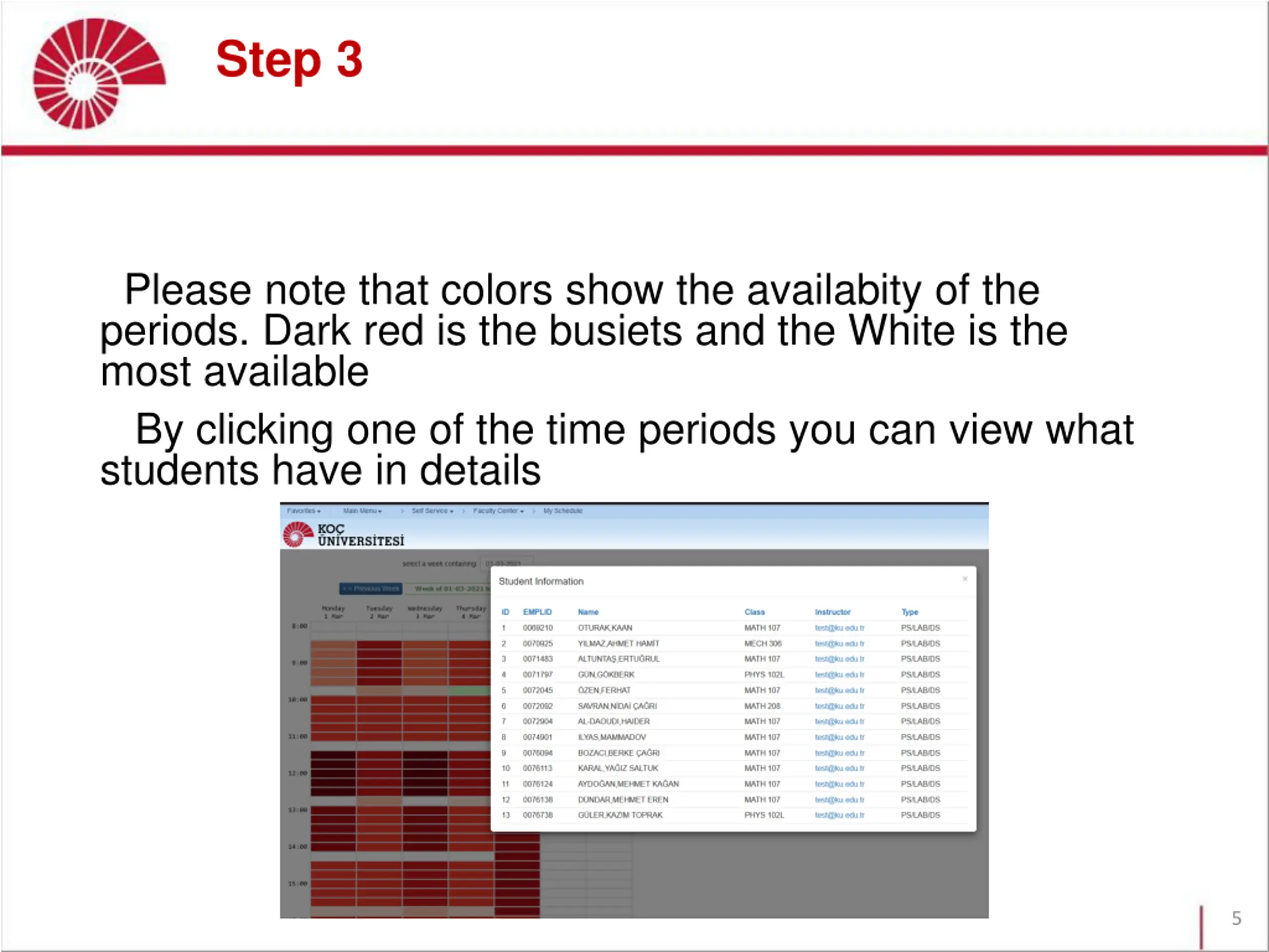 Step 3 Please note that colors show the availabity of the periods. Dark red is the busiets and the White is the most available By clicking one of the time periods you can view what students have in details 5