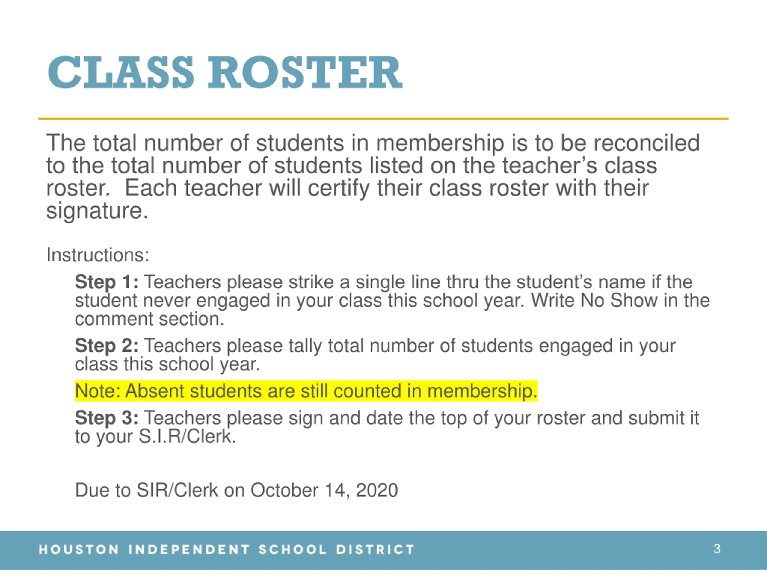 CLASS ROSTER The total number of students in membership is to be reconciled to the total number of students listed on the teacher s class roster. Each teacher will certify their class roster with their signature. Instructions: Step 1:Teachers please strike a single line thru the student s name if the student never engaged in your class this school year. Write No Show in the comment section. Step 2: Teachers please tally total number of students engaged in your class this school year. Note: Absent students are still counted in membership. Step 3: Teachers please sign and date the top of your roster and submit it to your S.I.R/Clerk. Due to SIR/Clerk on October 14, 2020 3
