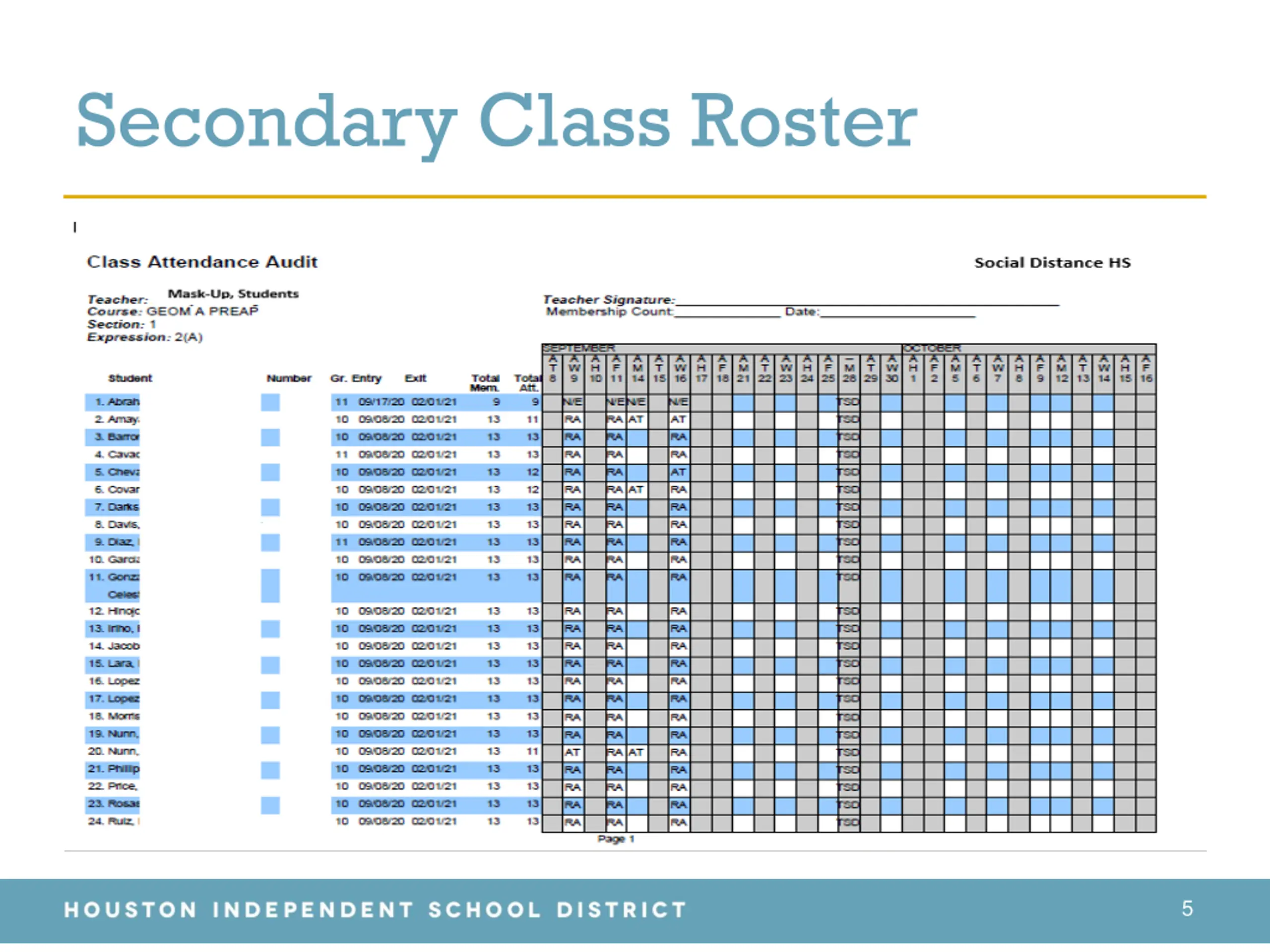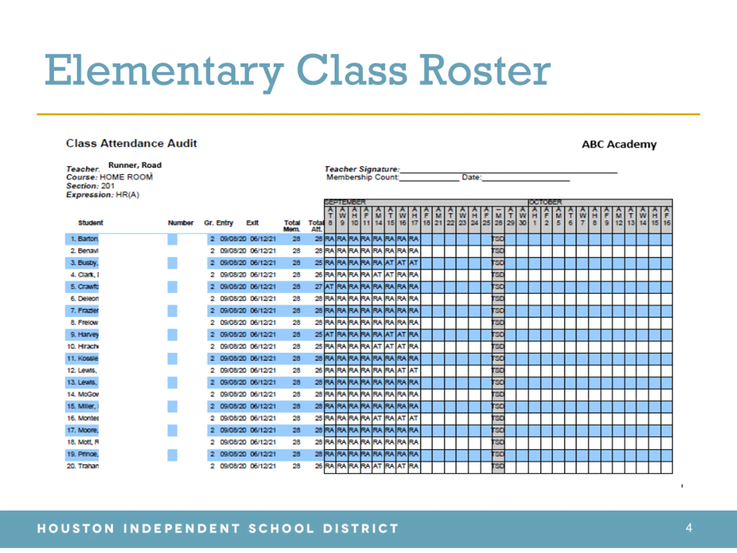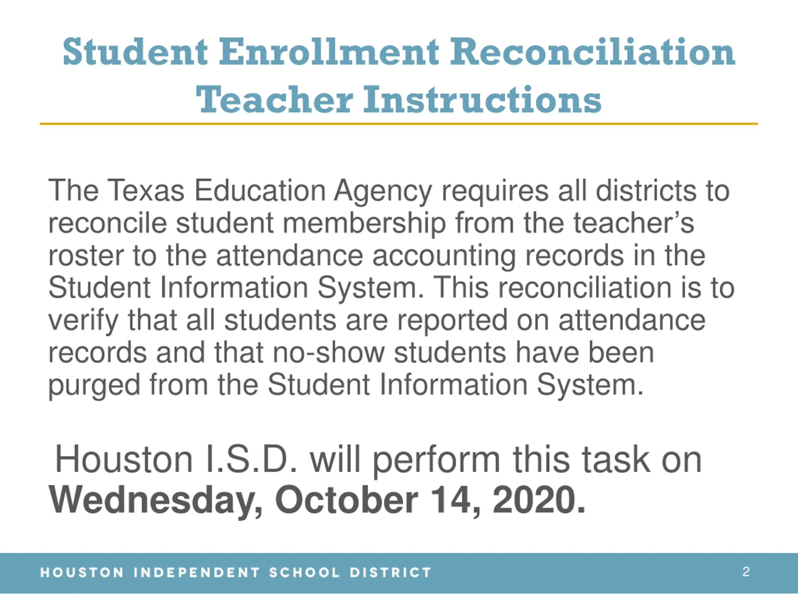 Student Enrollment Reconciliation Teacher Instructions The Texas Education Agency requires all districts to reconcile student membership from the teacher s roster to the attendance accounting records in the Student Information System. This reconciliation is to verify that all students are reported on attendance records and that no-show students have been purged from the Student Information System. Houston I.S.D. will perform this task on Wednesday, October 14, 2020. 2