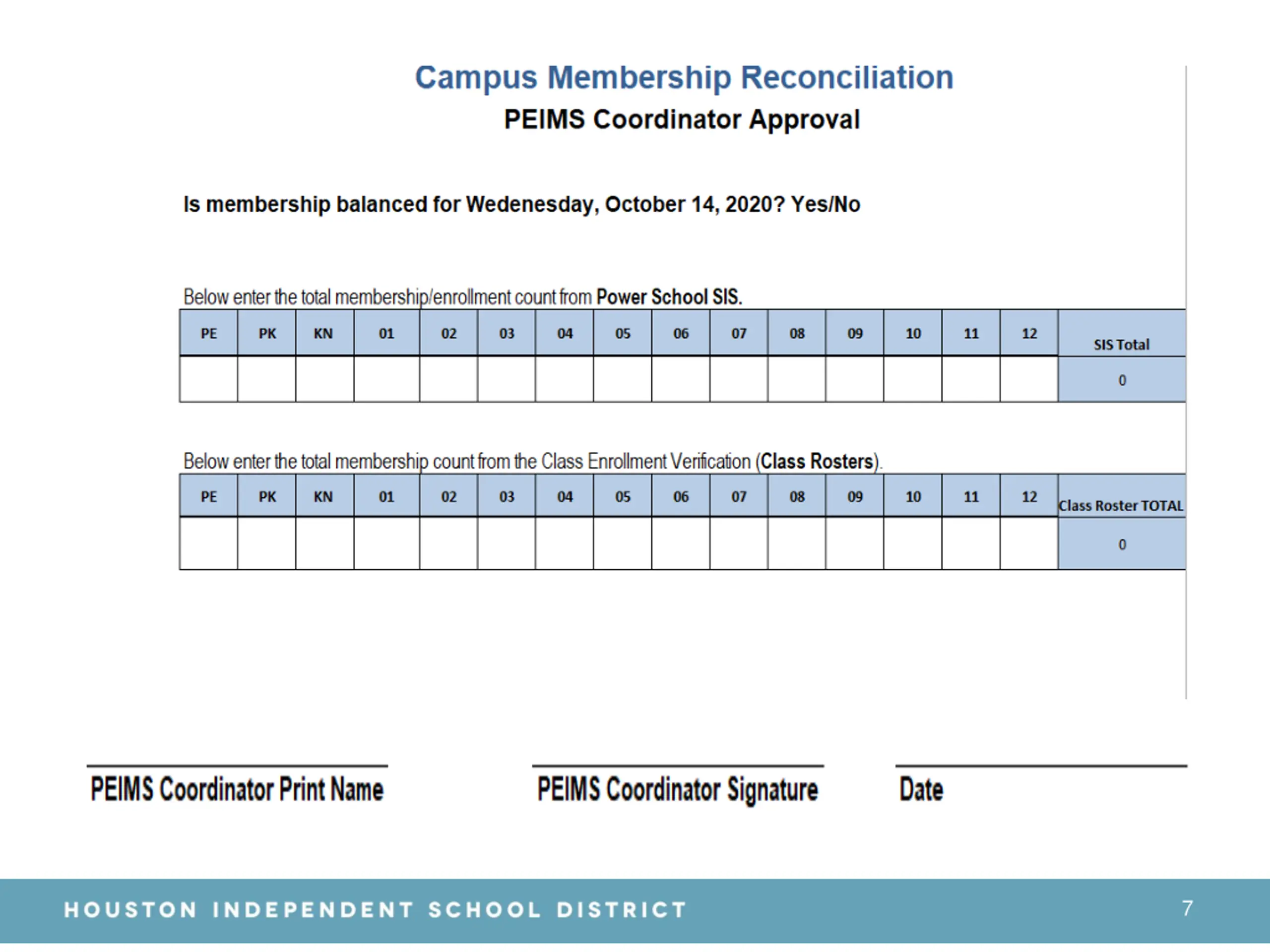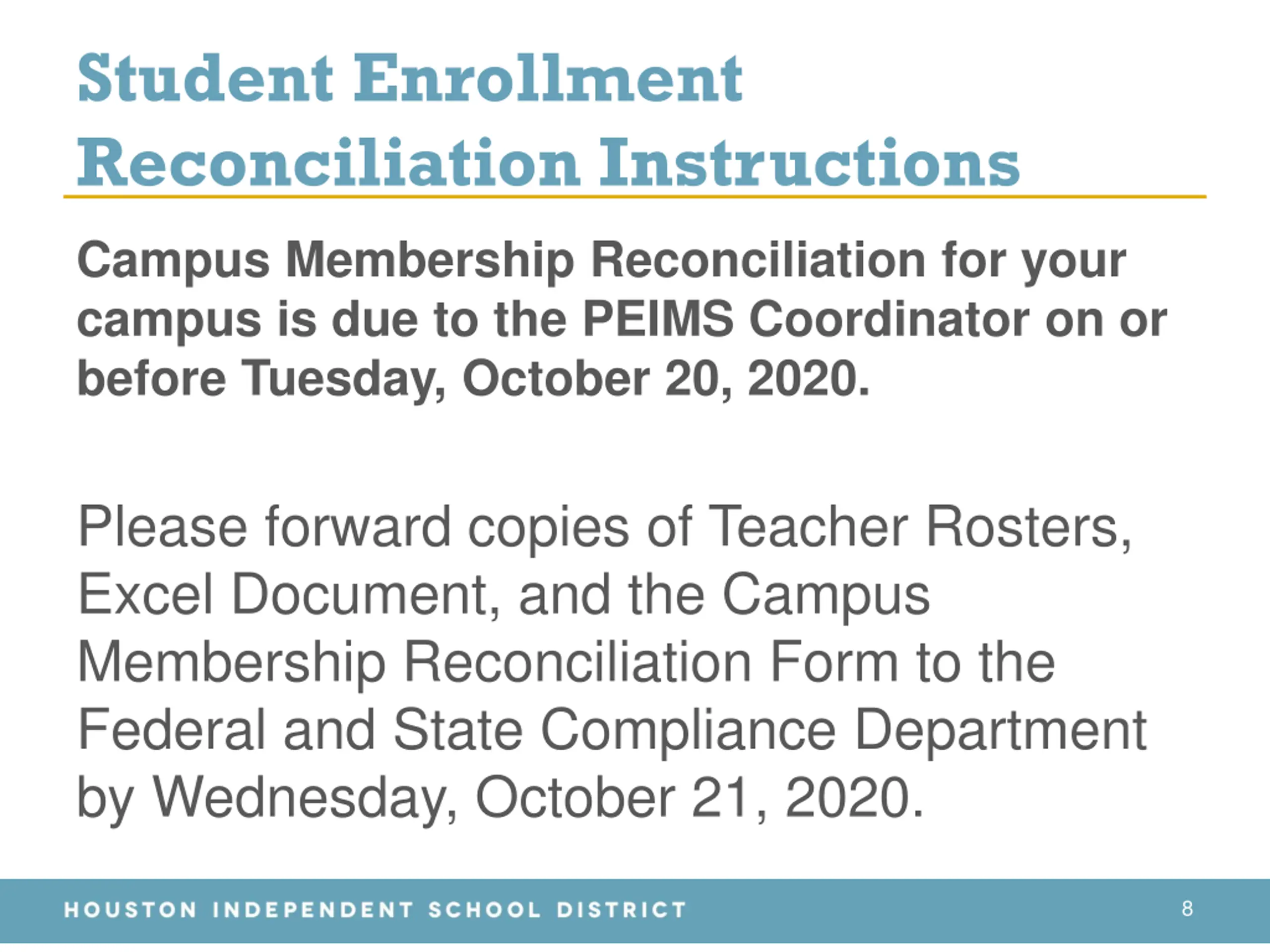 Student Enrollment Reconciliation Instructions Campus Membership Reconciliation for your campus is due to the PEIMS Coordinator on or before Tuesday, October 20, 2020. Please forward copies of Teacher Rosters, Excel Document, and the Campus Membership Reconciliation Form to the Federal and State Compliance Department by Wednesday, October 21, 2020. 8