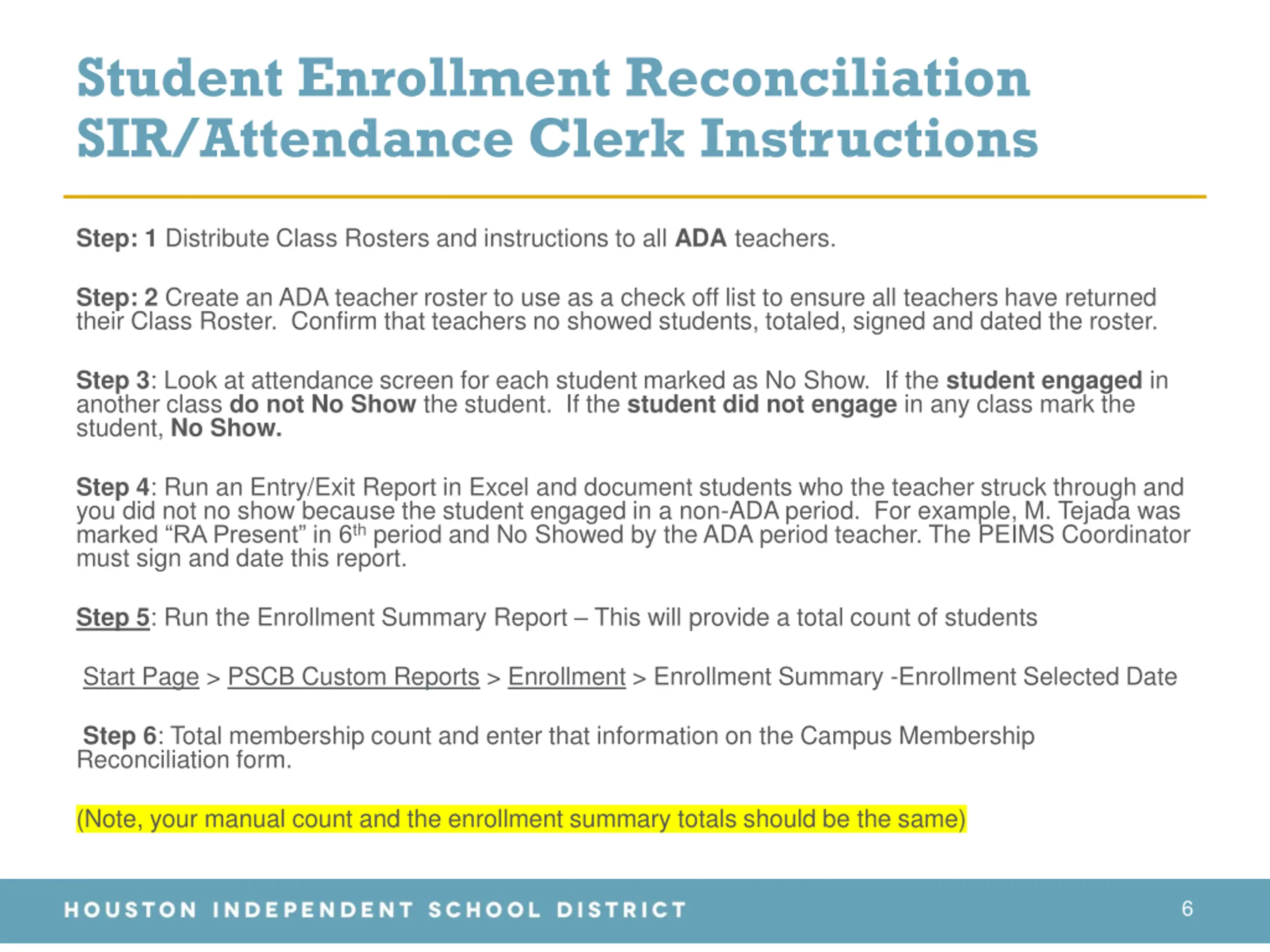 Student Enrollment Reconciliation SIR/Attendance Clerk Instructions Step: 1 Distribute Class Rosters and instructions to all ADA teachers. Step: 2 Create an ADA teacher roster to use as a check off list to ensure all teachers have returned their Class Roster. Confirm that teachers no showed students, totaled, signed and dated the roster. Step 3: Look at attendance screen for each student marked as No Show. If the student engaged in another class do notNo Show the student. If the student did not engage in any class mark the student, No Show. Step 4: Run an Entry/Exit Report in Excel and document students who the teacher struck through and you did not no show because the student engaged in a non-ADA period. For example, M. Tejada was marked RA Present in 6th period and No Showed by the ADA period teacher. The PEIMS Coordinator must sign and date this report. Step 5: Run the Enrollment Summary Report This will provide a total count of students Start Page > PSCB Custom Reports > Enrollment > Enrollment Summary -Enrollment Selected Date Step 6: Total membership count and enter that information on the Campus Membership Reconciliation form. (Note, your manual count and the enrollment summary totals should be the same) 6
