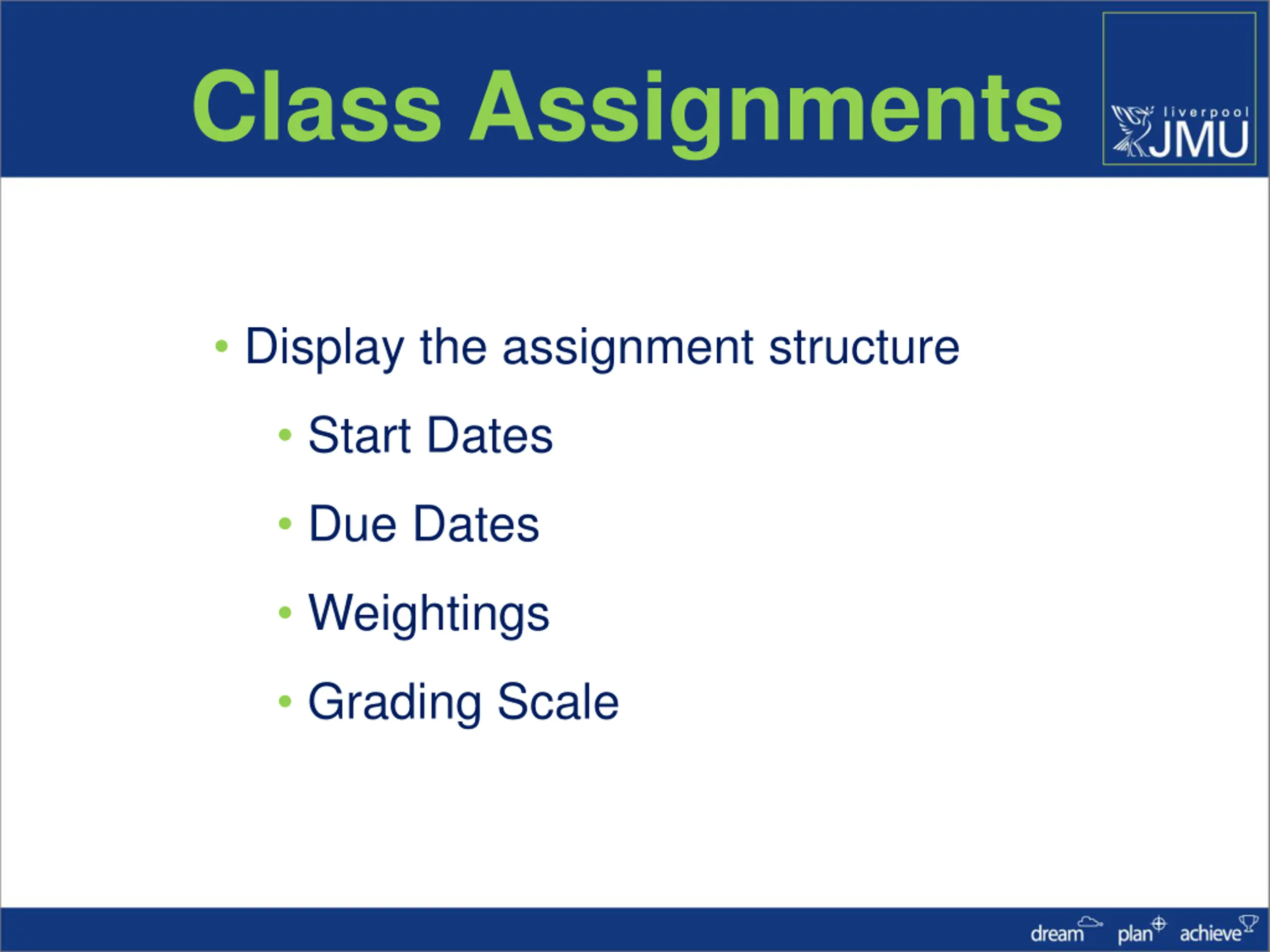 Class Assignments Display the assignment structure Start Dates Due Dates Weightings Grading Scale