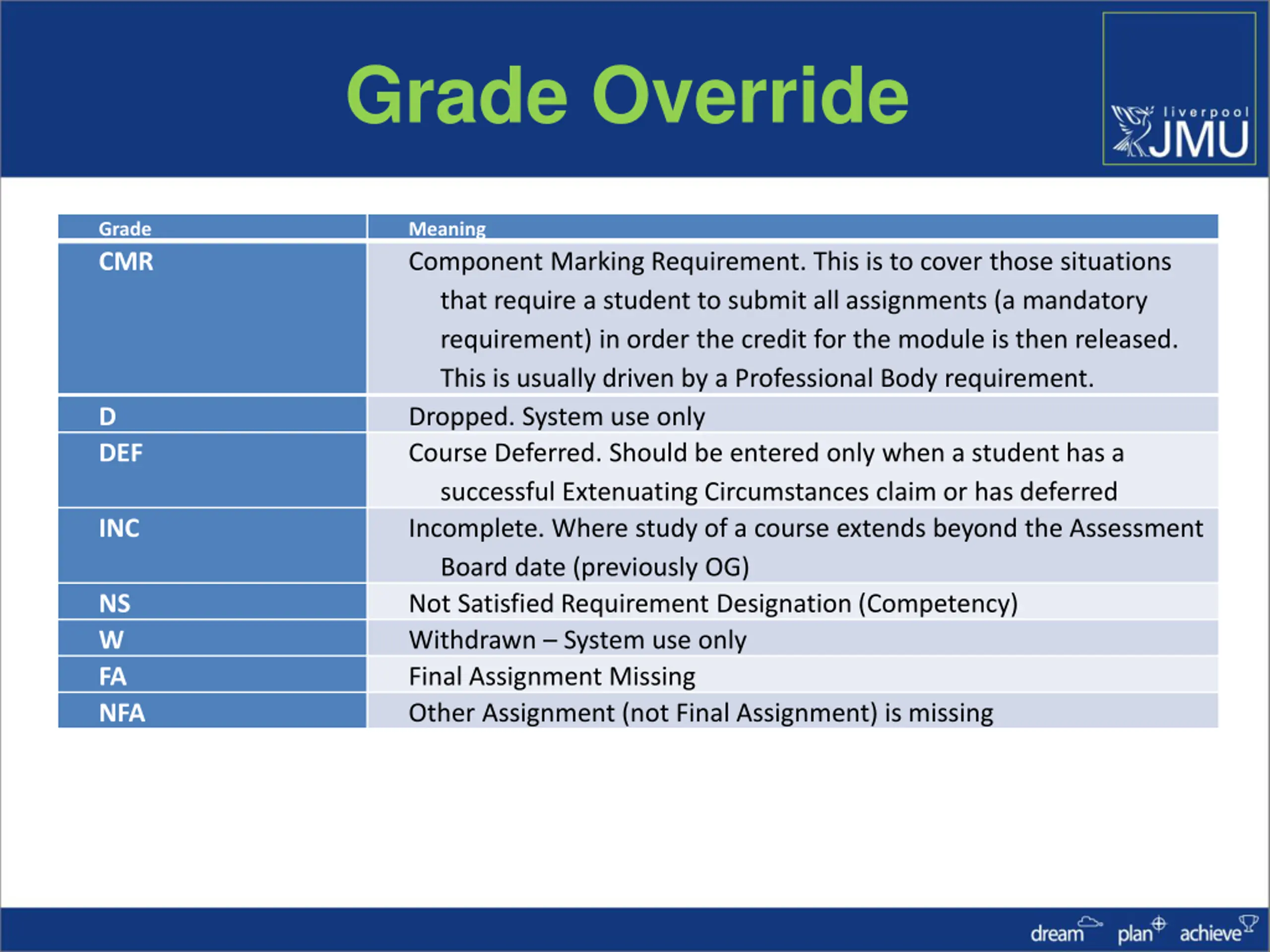 Grade Override Grade CMR Meaning Component Marking Requirement. This is to cover those situations that require a student to submit all assignments (a mandatory requirement) in order the credit for the module is then released. This is usually driven by a Professional Body requirement. Dropped. System use only Course Deferred. Should be entered only when a student has a successful Extenuating Circumstances claim or has deferred Incomplete. Where study of a course extends beyond the Assessment Board date (previously OG) Not Satisfied Requirement Designation (Competency) Withdrawn System use only Final Assignment Missing Other Assignment (not Final Assignment) is missing D DEF INC NS W FA NFA
