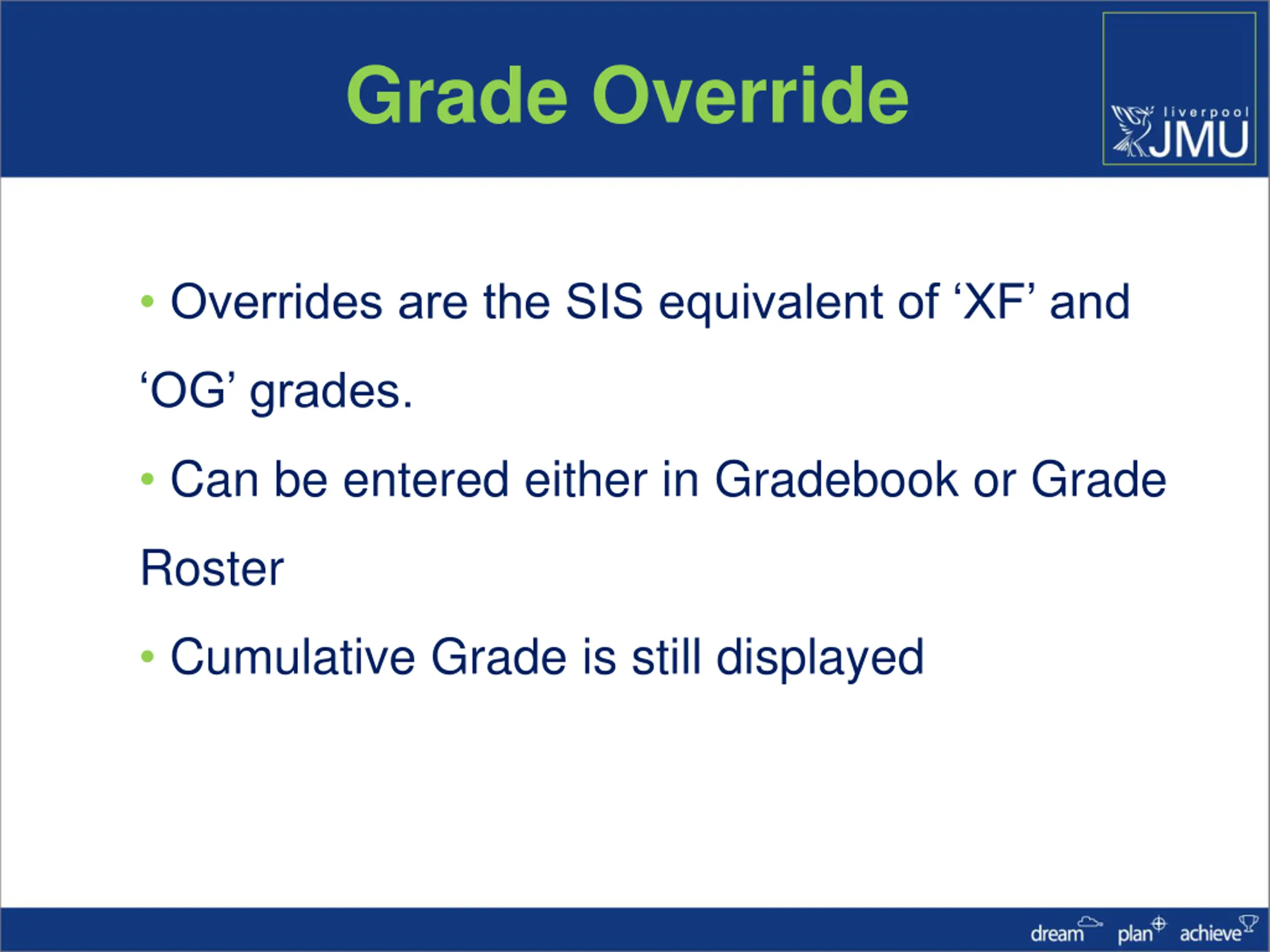 Grade Override Overrides are the SIS equivalent of XF and OG grades. Can be entered either in Gradebook or Grade Roster Cumulative Grade is still displayed