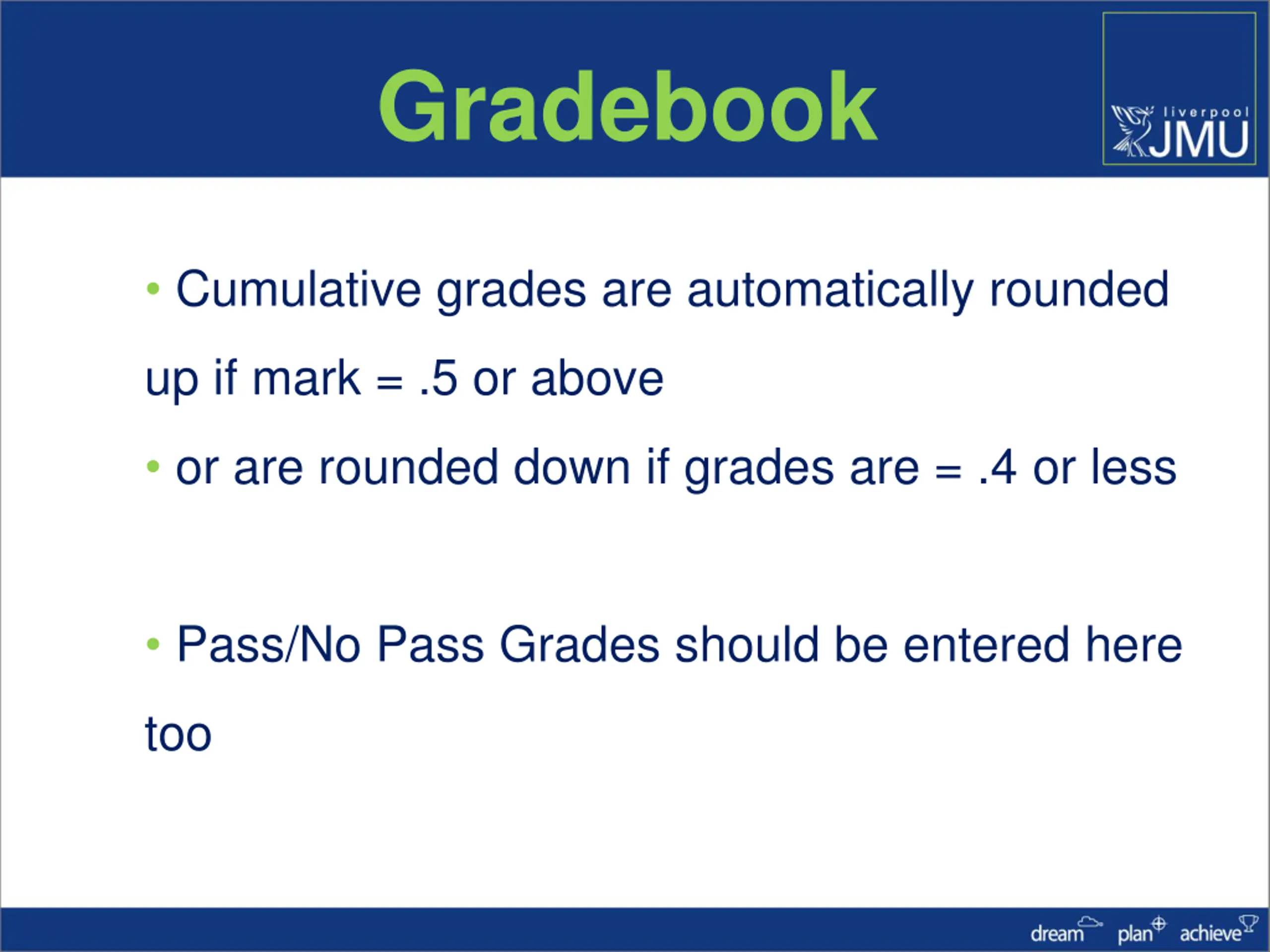Gradebook Cumulative grades are automatically rounded up if mark = .5 or above or are rounded down if grades are = .4 or less Pass/No Pass Grades should be entered here too
