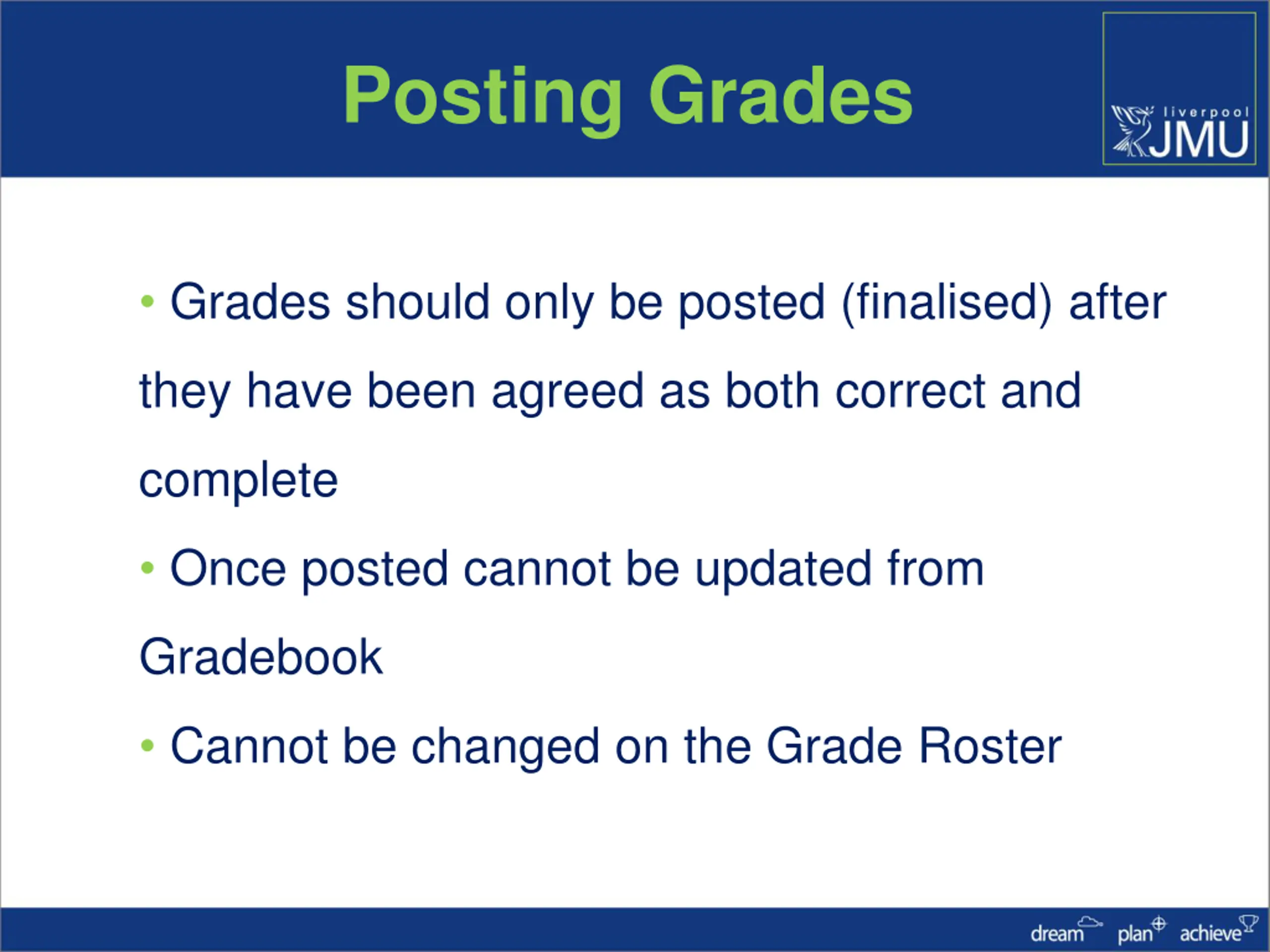 Posting Grades Grades should only be posted (finalised) after they have been agreed as both correct and complete Once posted cannot be updated from Gradebook Cannot be changed on the Grade Roster