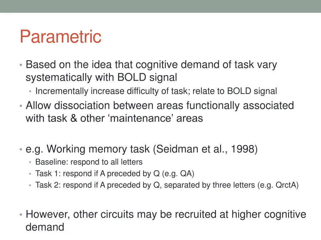 Parametric Based on the idea that cognitive demand of task vary systematically with BOLD signal Incrementally increase difficulty of task; relate to BOLD signal Allow dissociation between areas functionally associated with task & other maintenance areas e.g. Working memory task (Seidman et al., 1998) Baseline: respond to all letters Task 1: respond if A preceded by Q (e.g. QA) Task 2: respond if A preceded by Q, separated by three letters (e.g. QrctA) However, other circuits may be recruited at higher cognitive demand