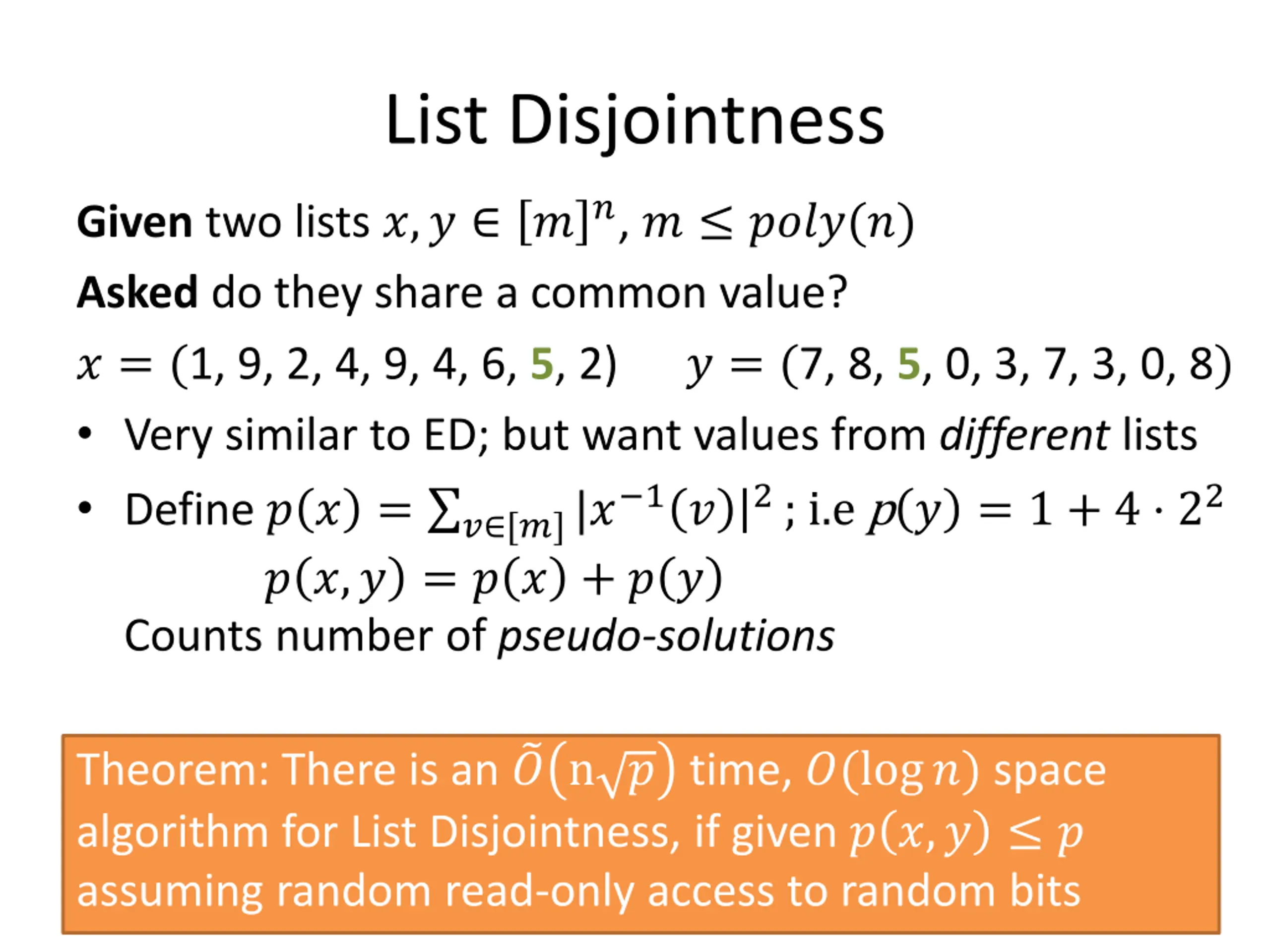 List Disjointness Given two lists ?,? ??, ? ????(?) Asked do they share a common value? ? = (1, 9, 2, 4, 9, 4, 6, 5, 2) Very similar to ED; but want values from different lists Define ? ? = ? [?]|? 1? |2; i.e p ? = 1 + 4 22 ? ?,? = ? ? + ? ? Counts number of pseudo-solutions ? = (7, 8, 5, 0, 3, 7, 3, 0, 8) Theorem: There is an ? n ? time, ?(log?) space algorithm for List Disjointness, if given ? ?,? ? assuming random read-only access to random bits