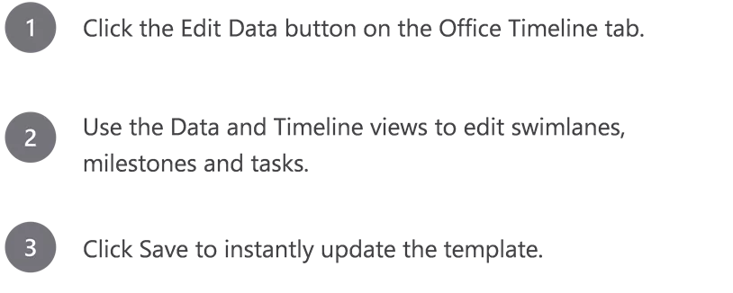 How to update this template in seconds How to update this template in seconds The Office Timeline add-in for PowerPoint will help you edit it with just a few clicks. Get your free 14-day trial of Office Timeline here: https://www.officetimeline.com/14-days-trial Re-open this template, and create your impressive PowerPoint visual in 3 easy steps: 1 Click the Edit Data button on the Office Timeline tab. Use the Data and Timeline views to edit swimlanes, milestones and tasks. 2 3 Click Save to instantly update the template.