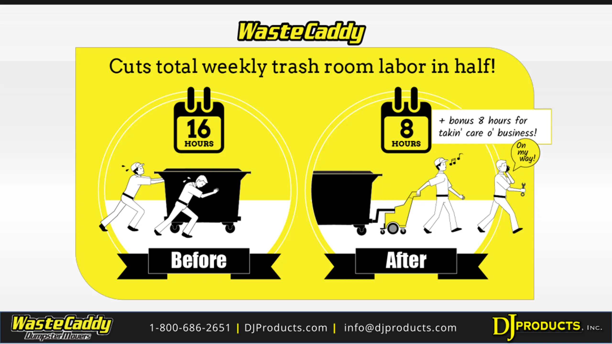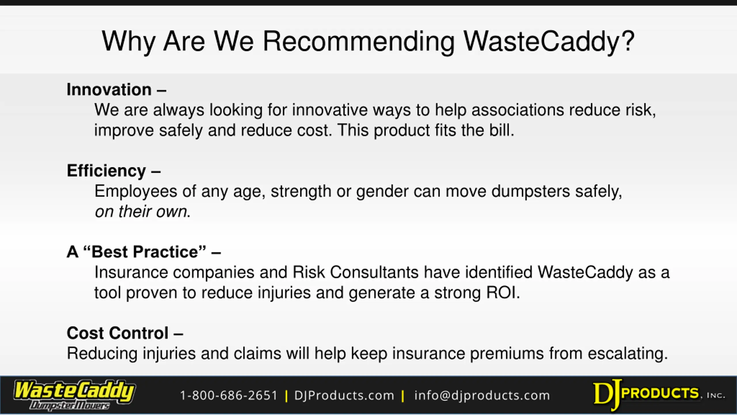 Why Are We Recommending WasteCaddy? Innovation We are always looking for innovative ways to help associations reduce risk, improve safely and reduce cost. This product fits the bill. Efficiency Employees of any age, strength or gender can move dumpsters safely, on their own. A Best Practice Insurance companies and Risk Consultants have identified WasteCaddy as a tool proven to reduce injuries and generate a strong ROI. Cost Control Reducing injuries and claims will help keep insurance premiums from escalating. 1-800-686-2651 | DJProducts.com | info@djproducts.com