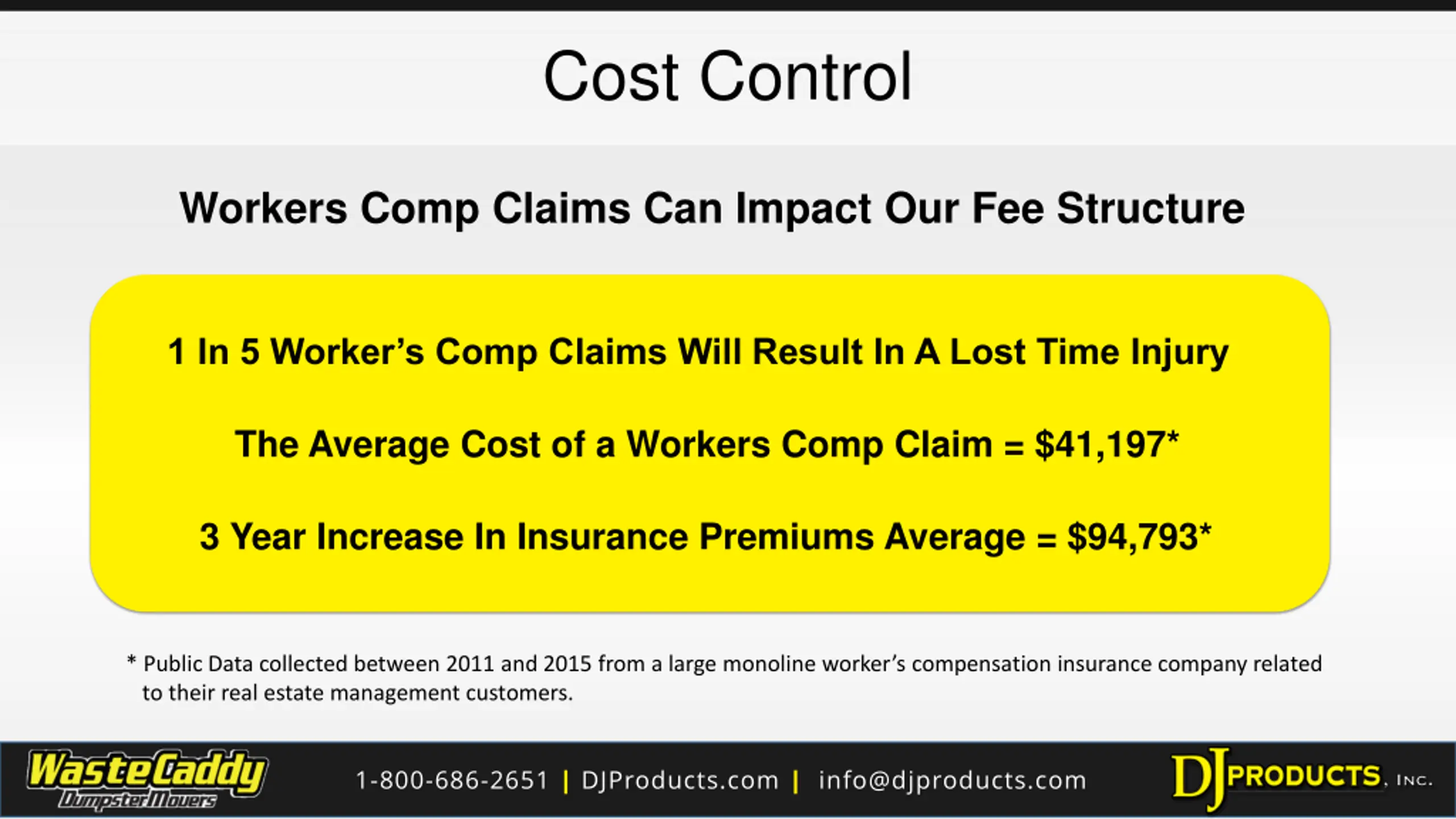 Cost Control Workers Comp Claims Can Impact Our Fee Structure 1 In 5 Worker s Comp Claims Will Result In A Lost Time Injury The Average Cost of a Workers Comp Claim = $41,197* 3 Year Increase In Insurance Premiums Average = $94,793* * Public Data collected between 2011 and 2015 from a large monoline worker s compensation insurance company related to their real estate management customers. 1-800-686-2651 | DJProducts.com | info@djproducts.com