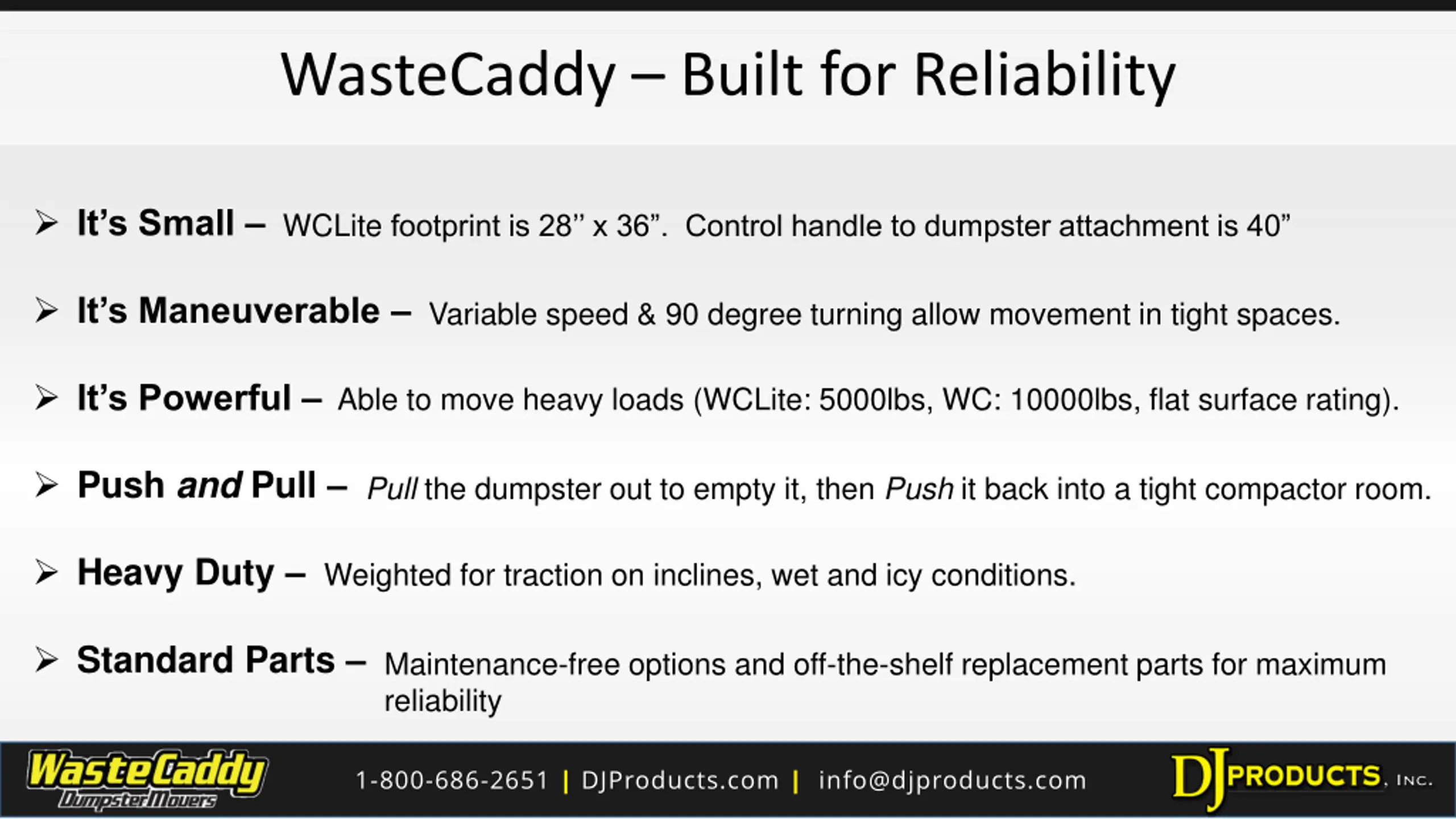 WasteCaddy Built for Reliability It s Small WCLite footprint is 28 x 36 . Control handle to dumpster attachment is 40 It s Maneuverable It s Powerful Variable speed & 90 degree turning allow movement in tight spaces. Able to move heavy loads (WCLite: 5000lbs, WC: 10000lbs, flat surface rating). Push and Pull Heavy Duty Pull the dumpster out to empty it, then Push it back into a tight compactor room. Weighted for traction on inclines, wet and icy conditions. Standard Parts Maintenance-free options and off-the-shelf replacement parts for maximum reliability 1-800-686-2651 | DJProducts.com | info@djproducts.com