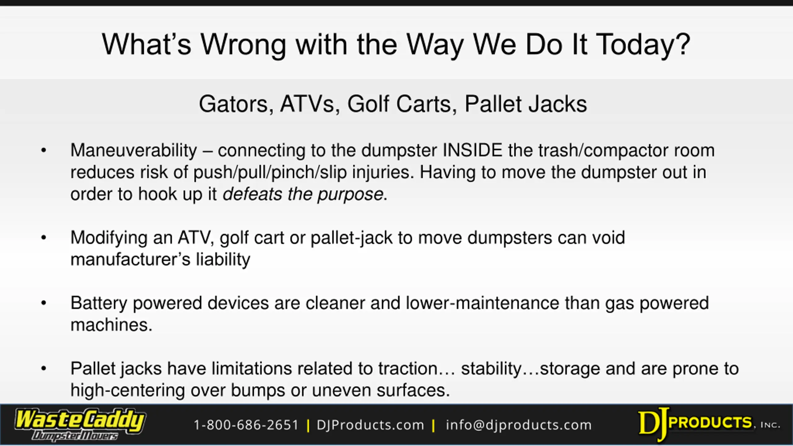 Whats Wrong with the Way We Do It Today? Gators, ATVs, Golf Carts, Pallet Jacks Maneuverability connecting to the dumpster INSIDE the trash/compactor room reduces risk of push/pull/pinch/slip injuries. Having to move the dumpster out in order to hook up it defeats the purpose. Modifying an ATV, golf cart or pallet-jack to move dumpsters can void manufacturer s liability Battery powered devices are cleaner and lower-maintenance than gas powered machines. Pallet jacks have limitations related to traction stability storage and are prone to high-centering over bumps or uneven surfaces. 1-800-686-2651 | DJProducts.com | info@djproducts.com