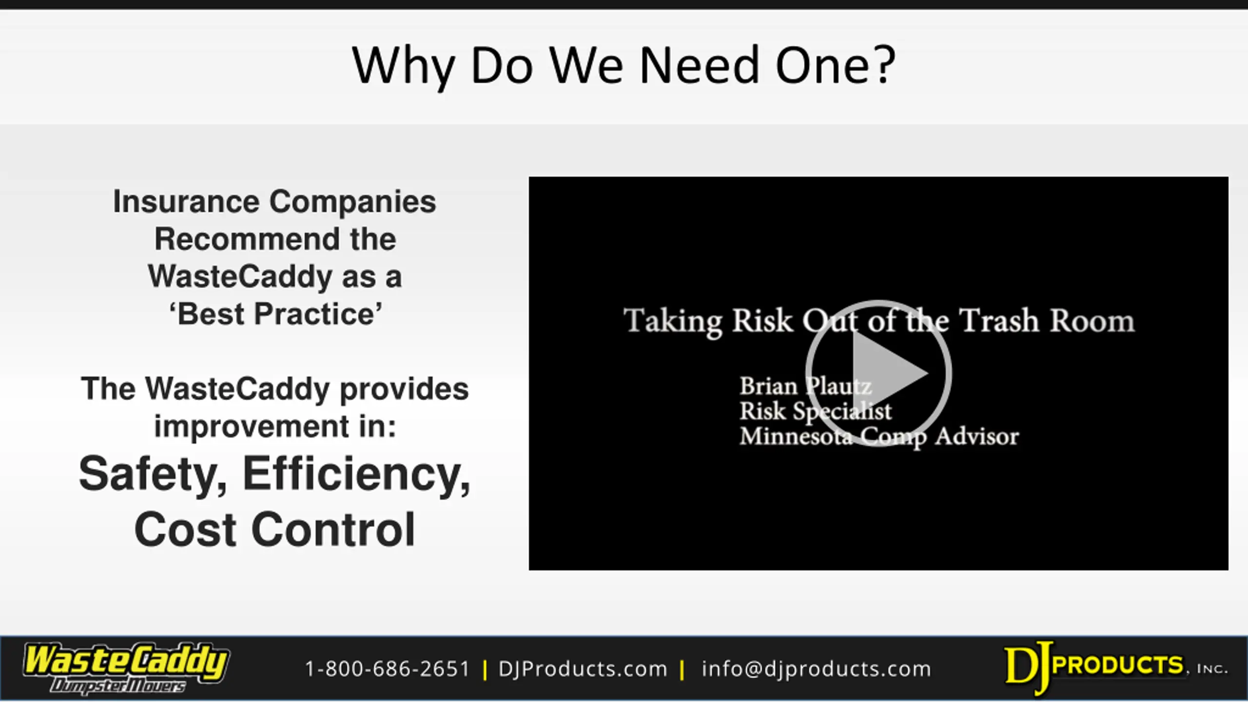 Why Do We Need One? Insurance Companies Recommend the WasteCaddy as a Best Practice The WasteCaddy provides improvement in: Safety, Efficiency, Cost Control 1-800-686-2651 | DJProducts.com | info@djproducts.com
