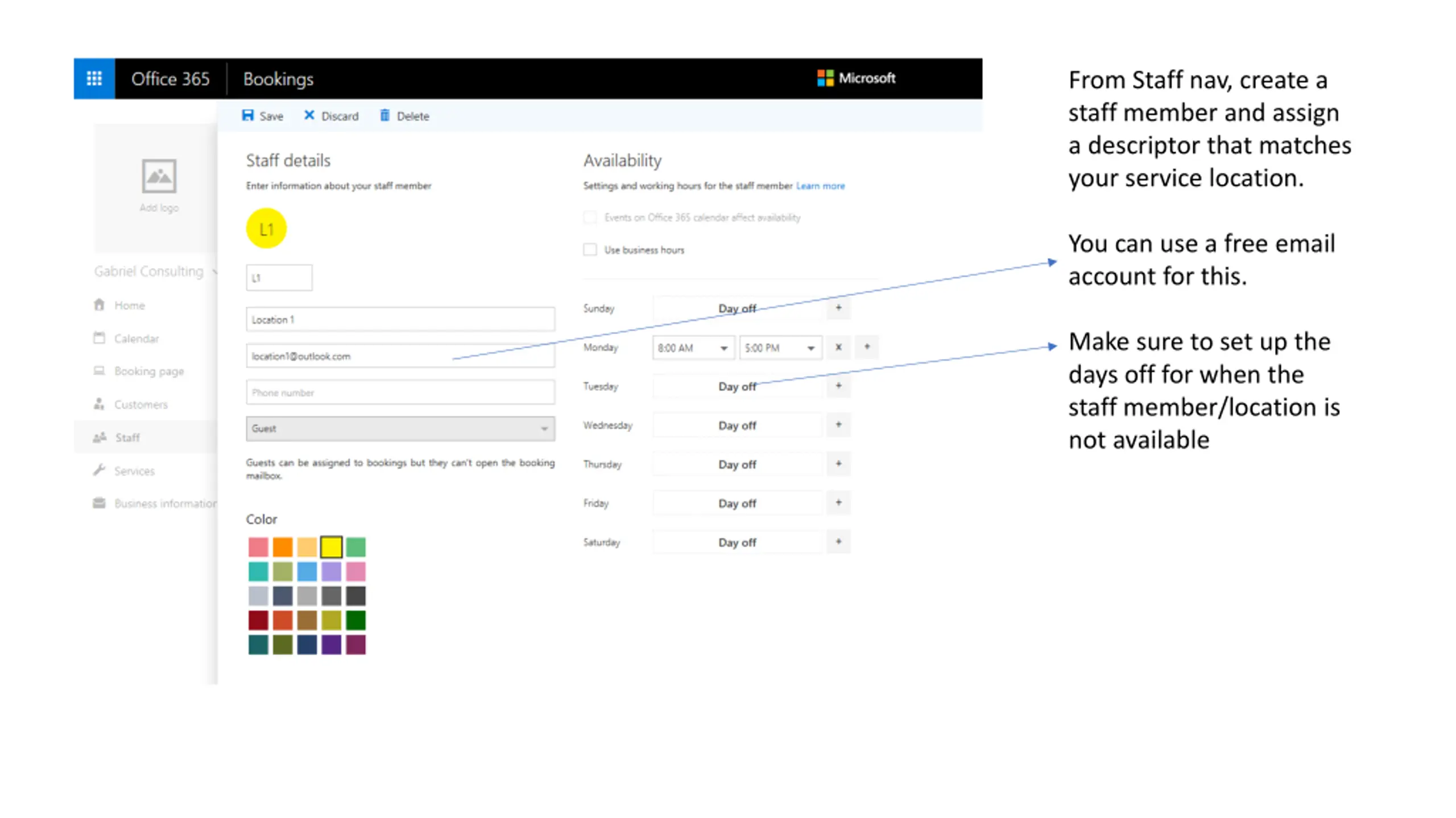 From Staff nav, create a staff member and assign a descriptor that matches your service location. You can use a free email account for this. Make sure to set up the days off for when the staff member/location is not available