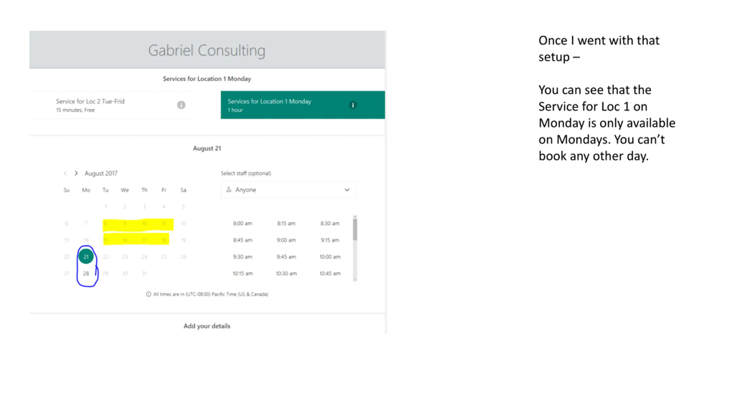 Once I went with that setup You can see that the Service for Loc 1 on Monday is only available on Mondays. You can t book any other day.