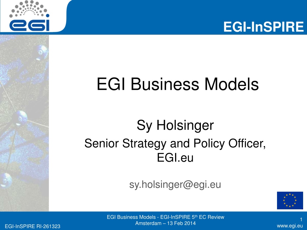 EGI-InSPIRE EGI Business Models Sy Holsinger Senior Strategy and Policy Officer, EGI.eu sy.holsinger@egi.eu EGI Business Models - EGI-InSPIRE 5th EC Review Amsterdam 13 Feb 2014 1 www.egi.eu www.egi.eu EGI-InSPIRE RI-261323 EGI-InSPIRE RI-261323