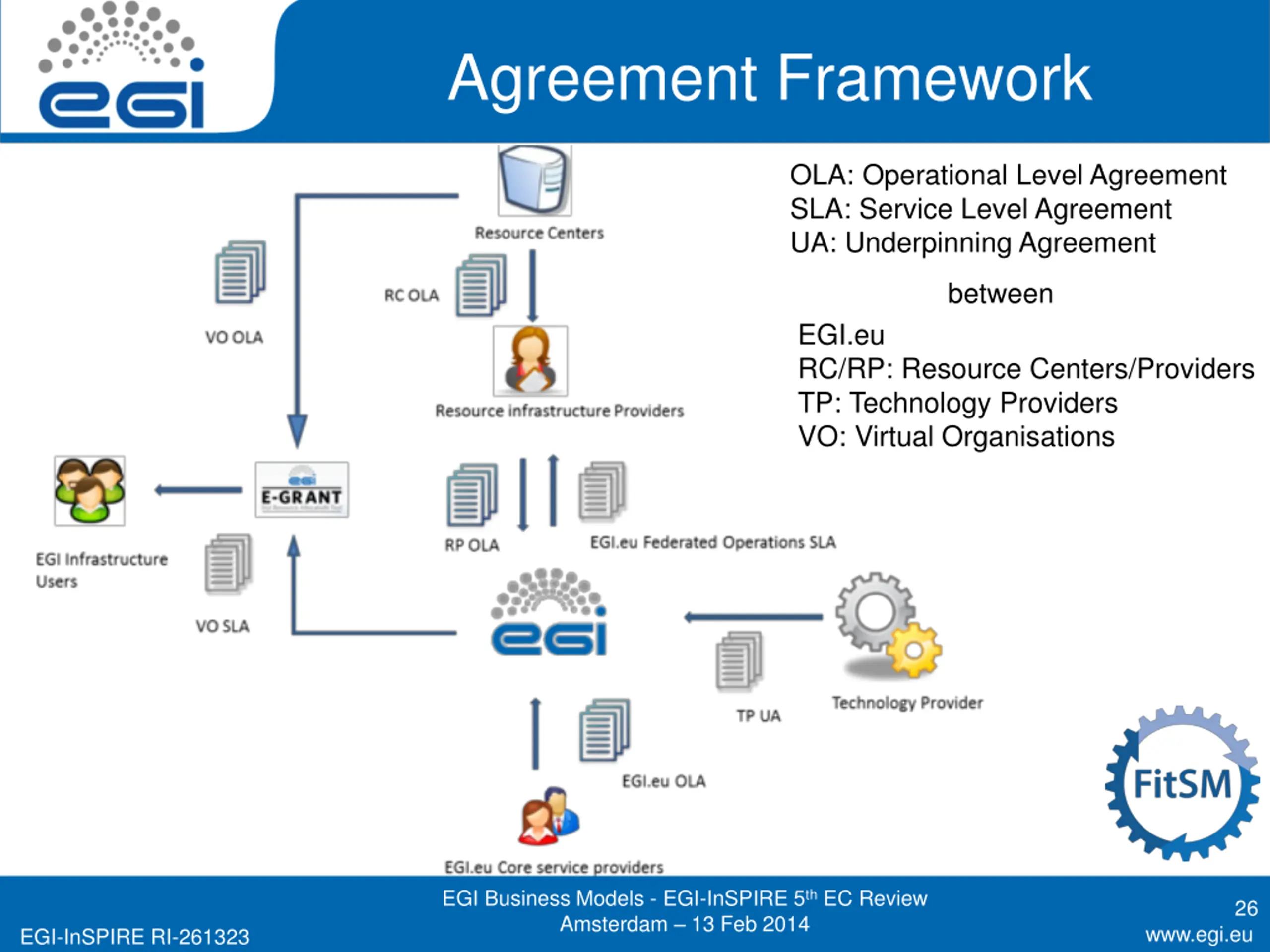 Agreement Framework OLA: Operational Level Agreement SLA: Service Level Agreement UA: Underpinning Agreement between EGI.eu RC/RP: Resource Centers/Providers TP: Technology Providers VO: Virtual Organisations EGI Business Models - EGI-InSPIRE 5th EC Review Amsterdam 13 Feb 2014 26 www.egi.eu EGI-InSPIRE RI-261323