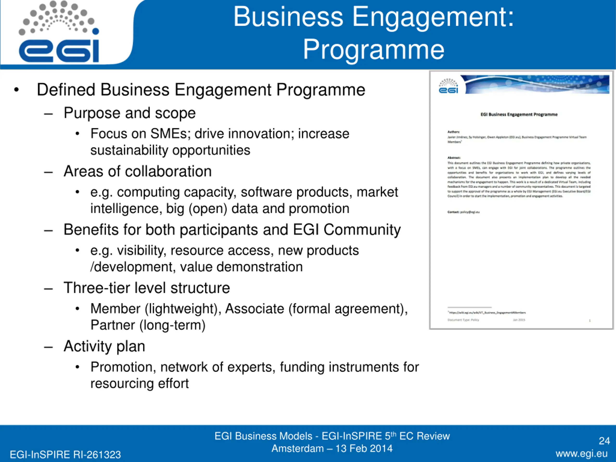 Business Engagement: Programme Defined Business Engagement Programme Purpose and scope Focus on SMEs; drive innovation; increase sustainability opportunities Areas of collaboration e.g. computing capacity, software products, market intelligence, big (open) data and promotion Benefits for both participants and EGI Community e.g. visibility, resource access, new products /development, value demonstration Three-tier level structure Member (lightweight), Associate (formal agreement), Partner (long-term) Activity plan Promotion, network of experts, funding instruments for resourcing effort EGI Business Models - EGI-InSPIRE 5th EC Review Amsterdam 13 Feb 2014 24 www.egi.eu EGI-InSPIRE RI-261323