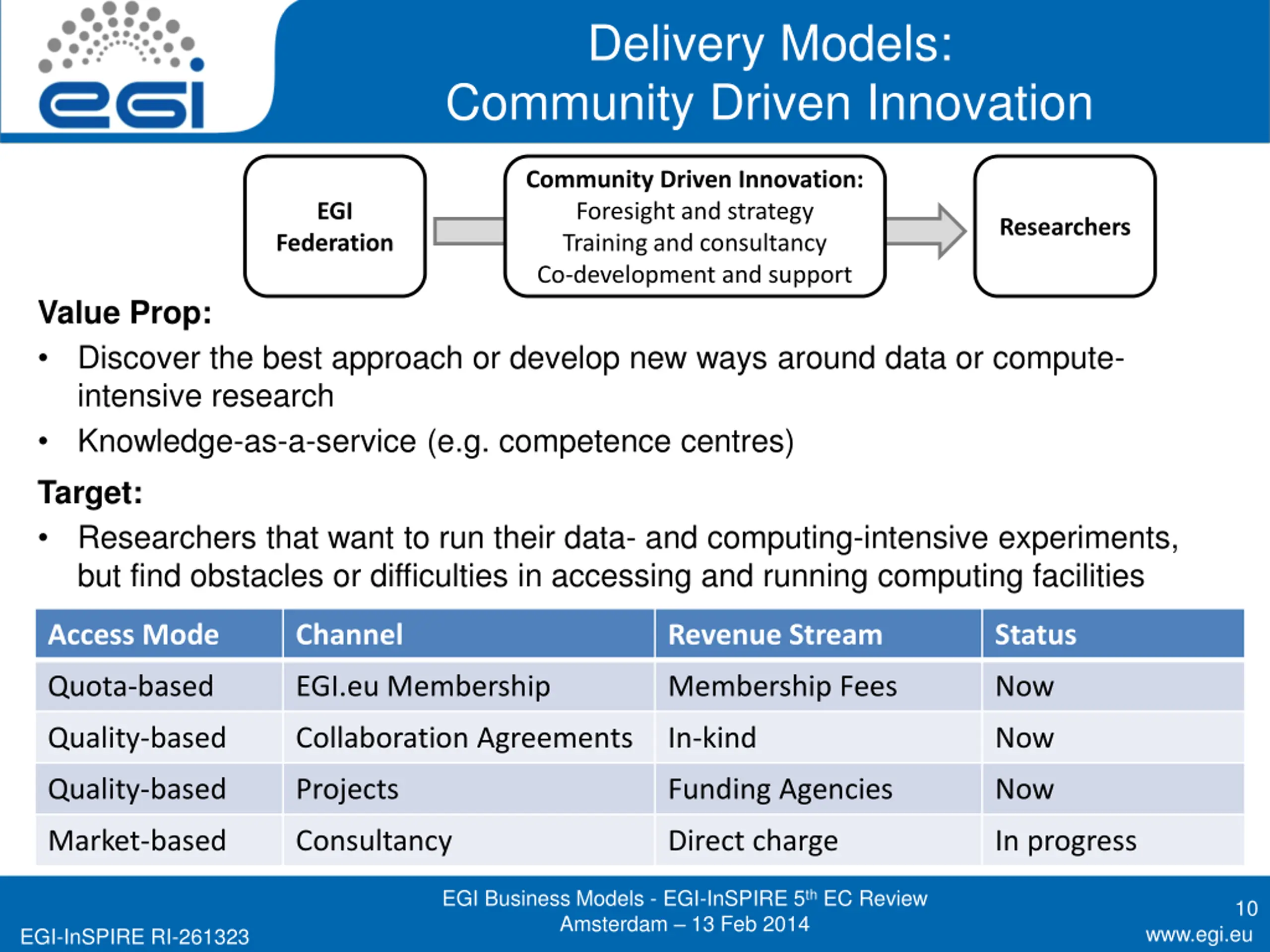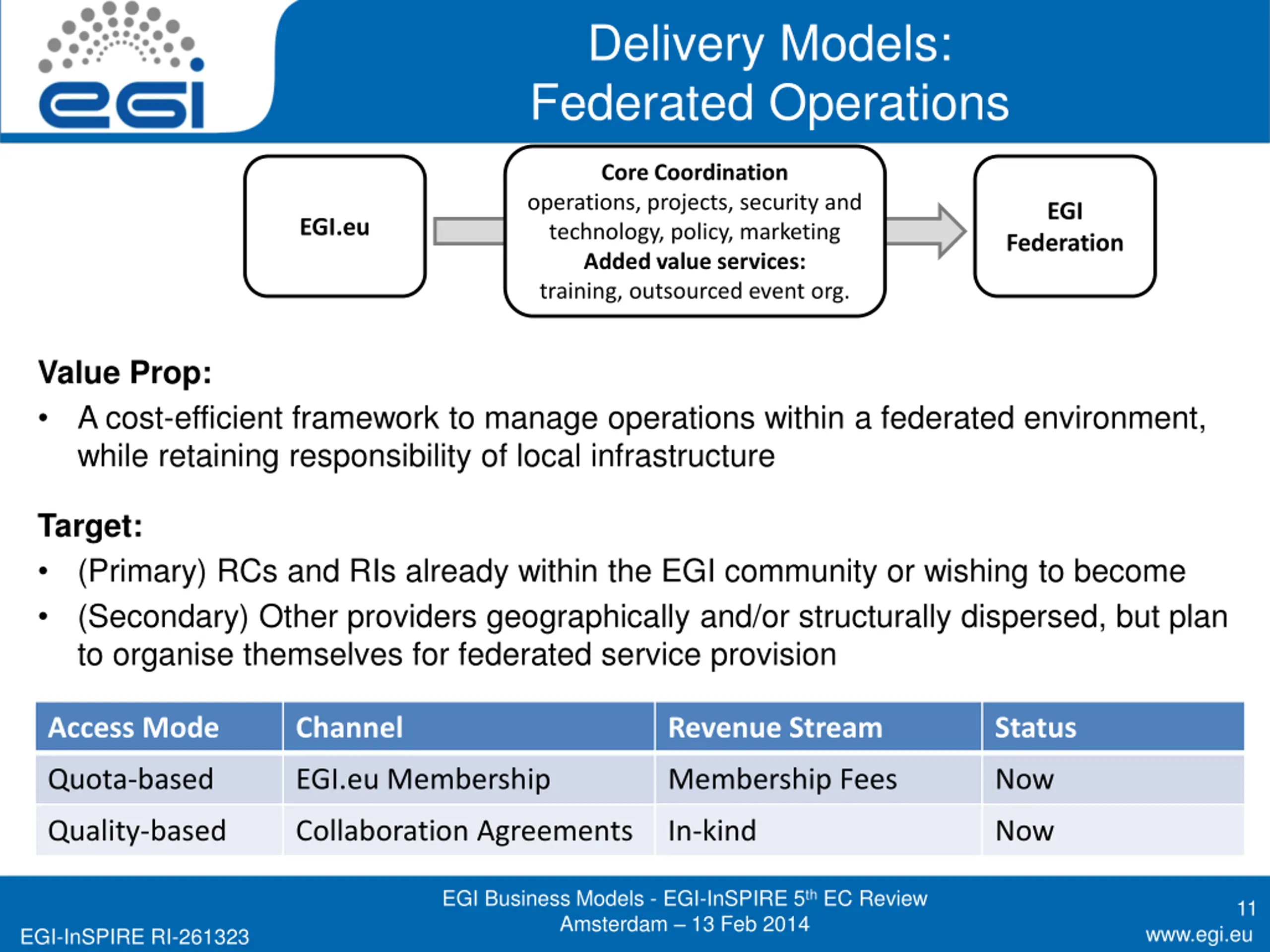 Delivery Models: Community Driven Innovation Community Driven Innovation: Foresight and strategy Training and consultancy Co-development and support EGI Researchers Federation Value Prop: Discover the best approach or develop new ways around data or compute- intensive research Knowledge-as-a-service (e.g. competence centres) Target: Researchers that want to run their data- and computing-intensive experiments, but find obstacles or difficulties in accessing and running computing facilities Access Mode Channel Revenue Stream Status Quota-based EGI.eu Membership Membership Fees Now Quality-based Collaboration Agreements In-kind Now Quality-based Projects Funding Agencies Now Market-based Consultancy Direct charge In progress EGI Business Models - EGI-InSPIRE 5th EC Review Amsterdam 13 Feb 2014 10 www.egi.eu EGI-InSPIRE RI-261323