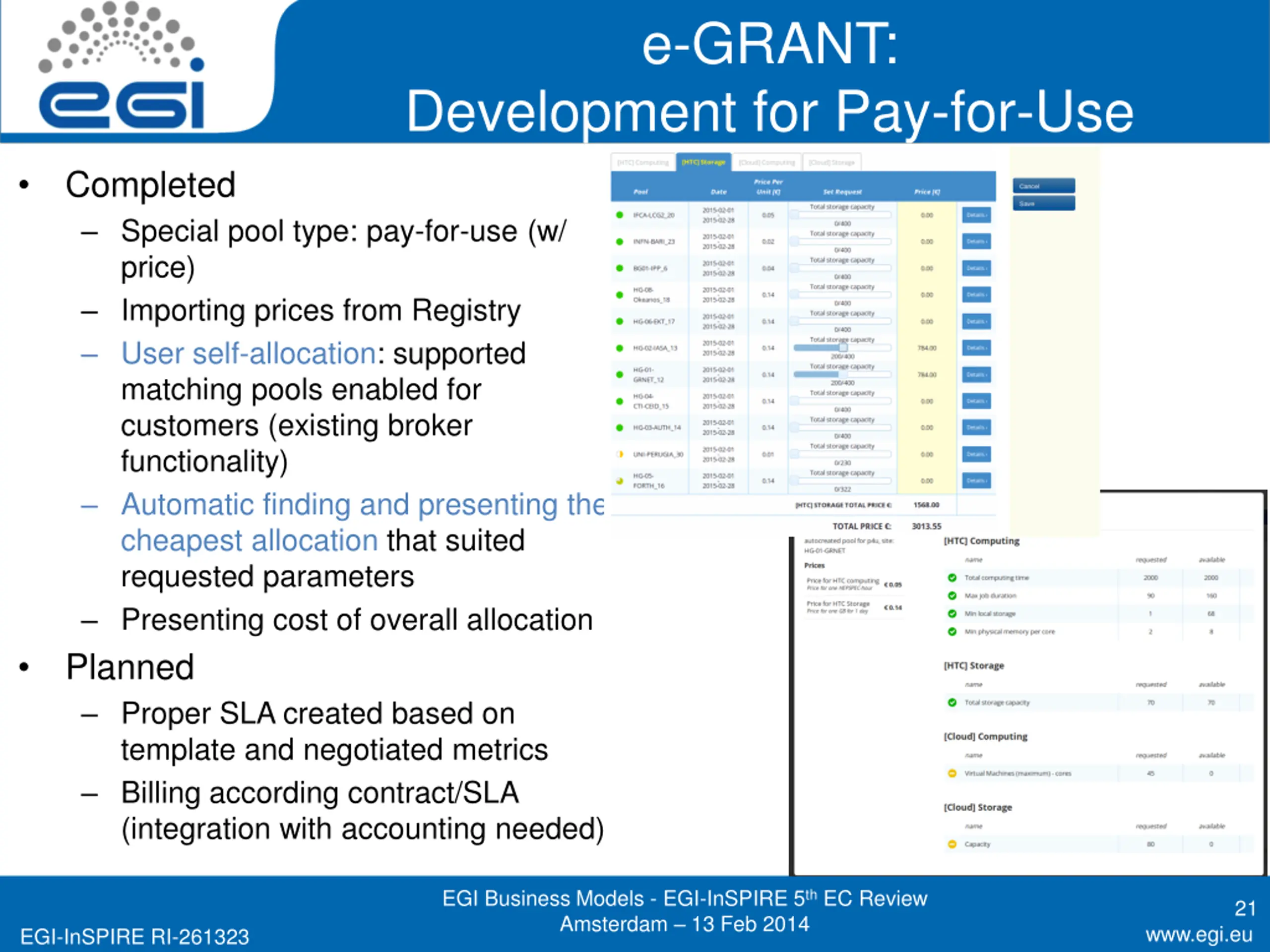 e-GRANT: Development for Pay-for-Use Completed Special pool type: pay-for-use (w/ price) Importing prices from Registry User self-allocation: supported matching pools enabled for customers (existing broker functionality) Automatic finding and presenting the cheapest allocation that suited requested parameters Presenting cost of overall allocation Planned Proper SLA created based on template and negotiated metrics Billing according contract/SLA (integration with accounting needed) EGI Business Models - EGI-InSPIRE 5th EC Review Amsterdam 13 Feb 2014 21 www.egi.eu EGI-InSPIRE RI-261323