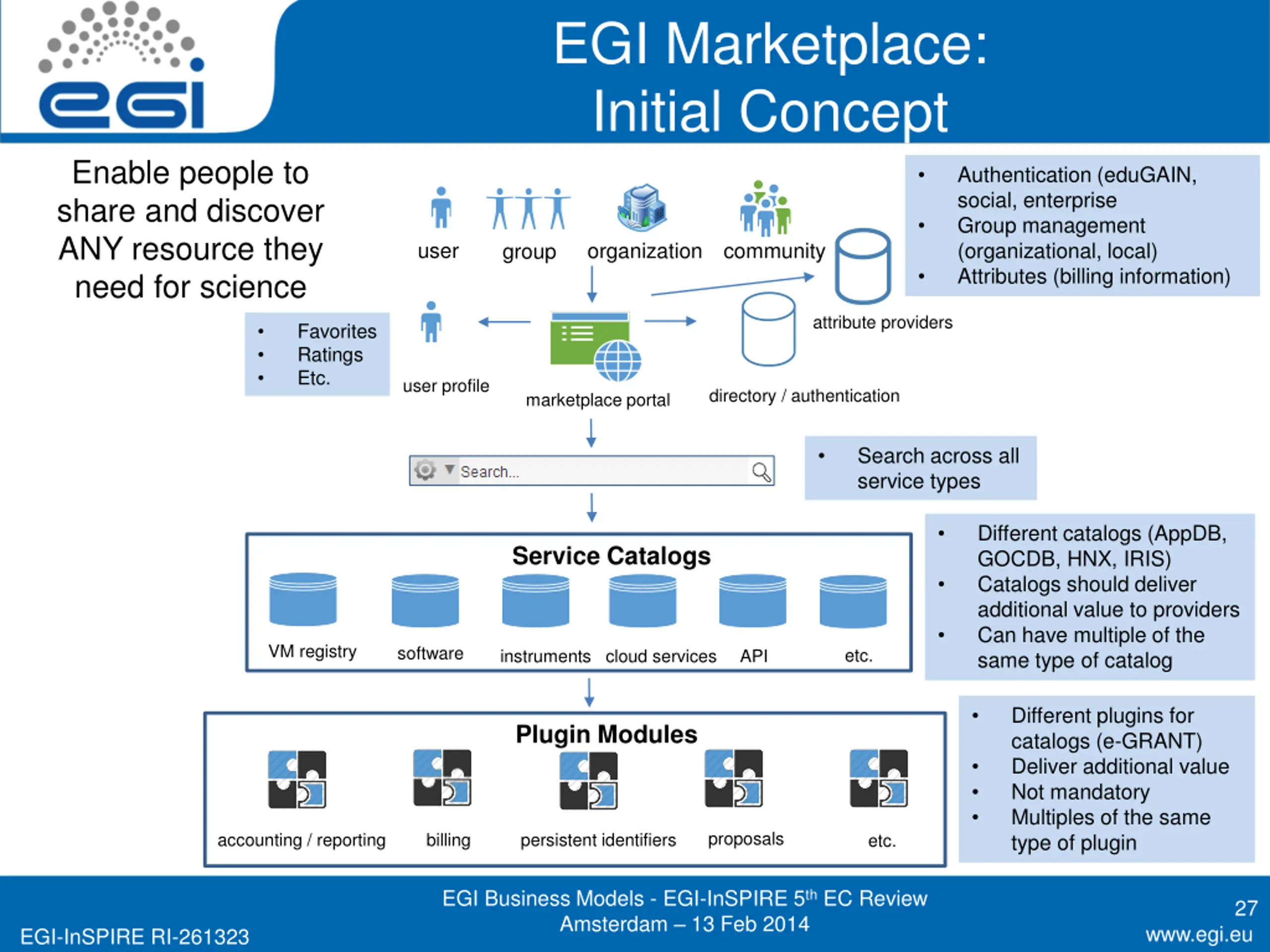 EGI Marketplace: Initial Concept Enable people to share and discover ANY resource they need for science Authentication (eduGAIN, social, enterprise Group management (organizational, local) Attributes (billing information) user organization community group attribute providers Favorites Ratings Etc. user profile directory / authentication marketplace portal Search across all service types Different catalogs (AppDB, GOCDB, HNX, IRIS) Catalogs should deliver additional value to providers Can have multiple of the same type of catalog Service Catalogs VM registry software etc. instruments cloud services API Different plugins for catalogs (e-GRANT) Deliver additional value Not mandatory Multiples of the same type of plugin Plugin Modules proposals accounting / reporting billing persistent identifiers etc. EGI Business Models - EGI-InSPIRE 5th EC Review Amsterdam 13 Feb 2014 27 www.egi.eu EGI-InSPIRE RI-261323