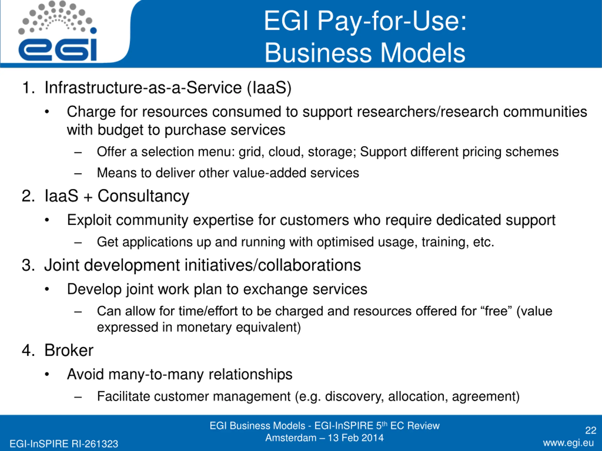 EGI Pay-for-Use: Business Models 1. Infrastructure-as-a-Service (IaaS) Charge for resources consumed to support researchers/research communities with budget to purchase services Offer a selection menu: grid, cloud, storage; Support different pricing schemes Means to deliver other value-added services 2. IaaS + Consultancy Exploit community expertise for customers who require dedicated support Get applications up and running with optimised usage, training, etc. 3. Joint development initiatives/collaborations Develop joint work plan to exchange services Can allow for time/effort to be charged and resources offered for free (value expressed in monetary equivalent) 4. Broker Avoid many-to-many relationships Facilitate customer management (e.g. discovery, allocation, agreement) EGI Business Models - EGI-InSPIRE 5th EC Review Amsterdam 13 Feb 2014 22 www.egi.eu EGI-InSPIRE RI-261323