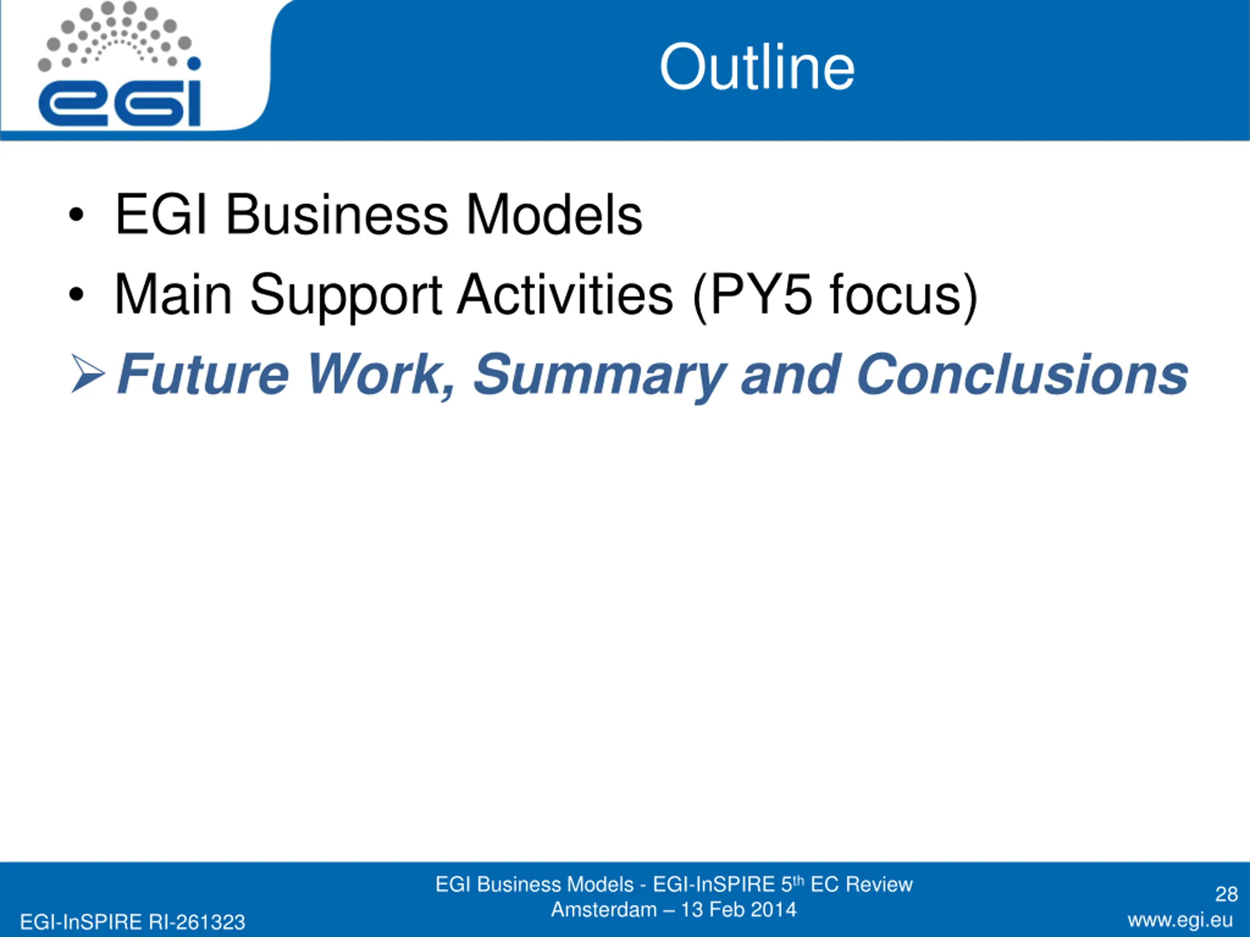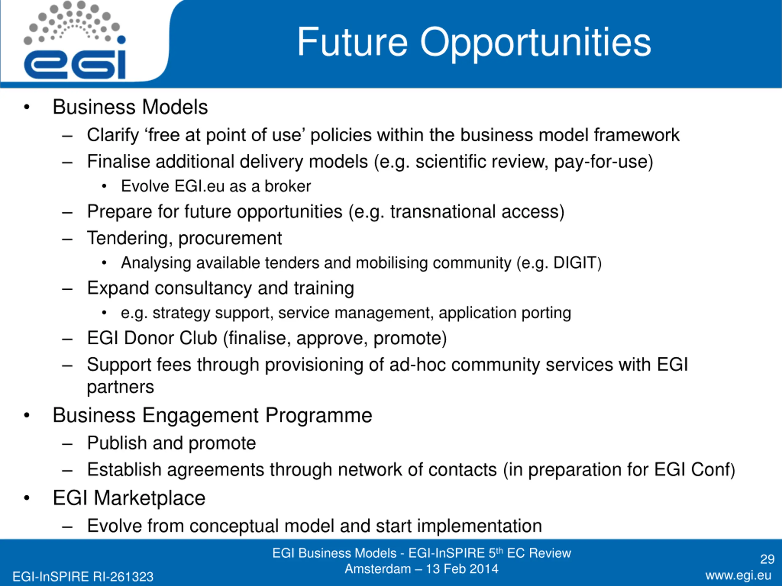 Outline EGI Business Models Main Support Activities (PY5 focus) Future Work, Summary and Conclusions EGI Business Models - EGI-InSPIRE 5th EC Review Amsterdam 13 Feb 2014 28 www.egi.eu EGI-InSPIRE RI-261323