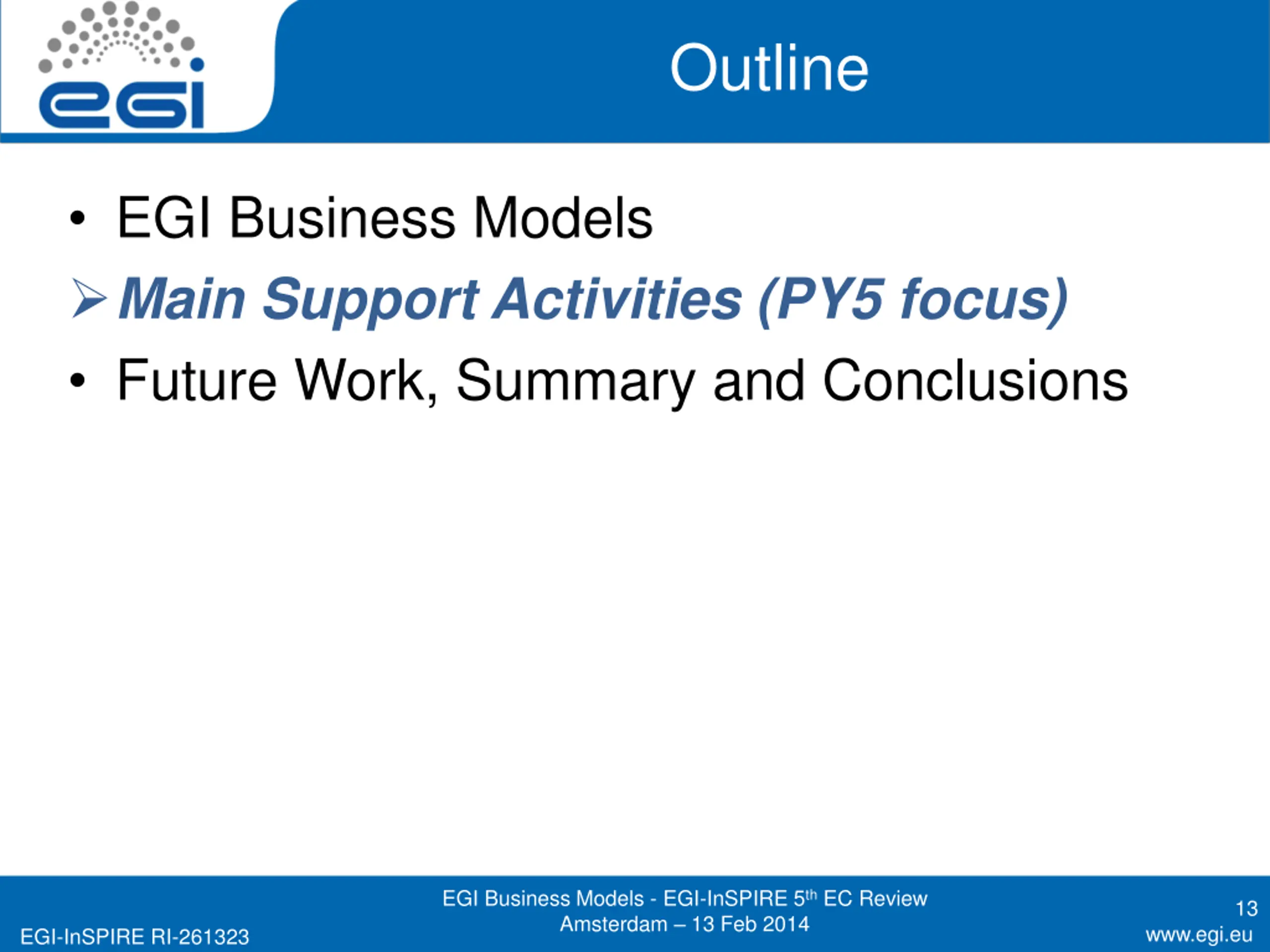 Outline EGI Business Models Main Support Activities (PY5 focus) Future Work, Summary and Conclusions EGI Business Models - EGI-InSPIRE 5th EC Review Amsterdam 13 Feb 2014 13 www.egi.eu EGI-InSPIRE RI-261323