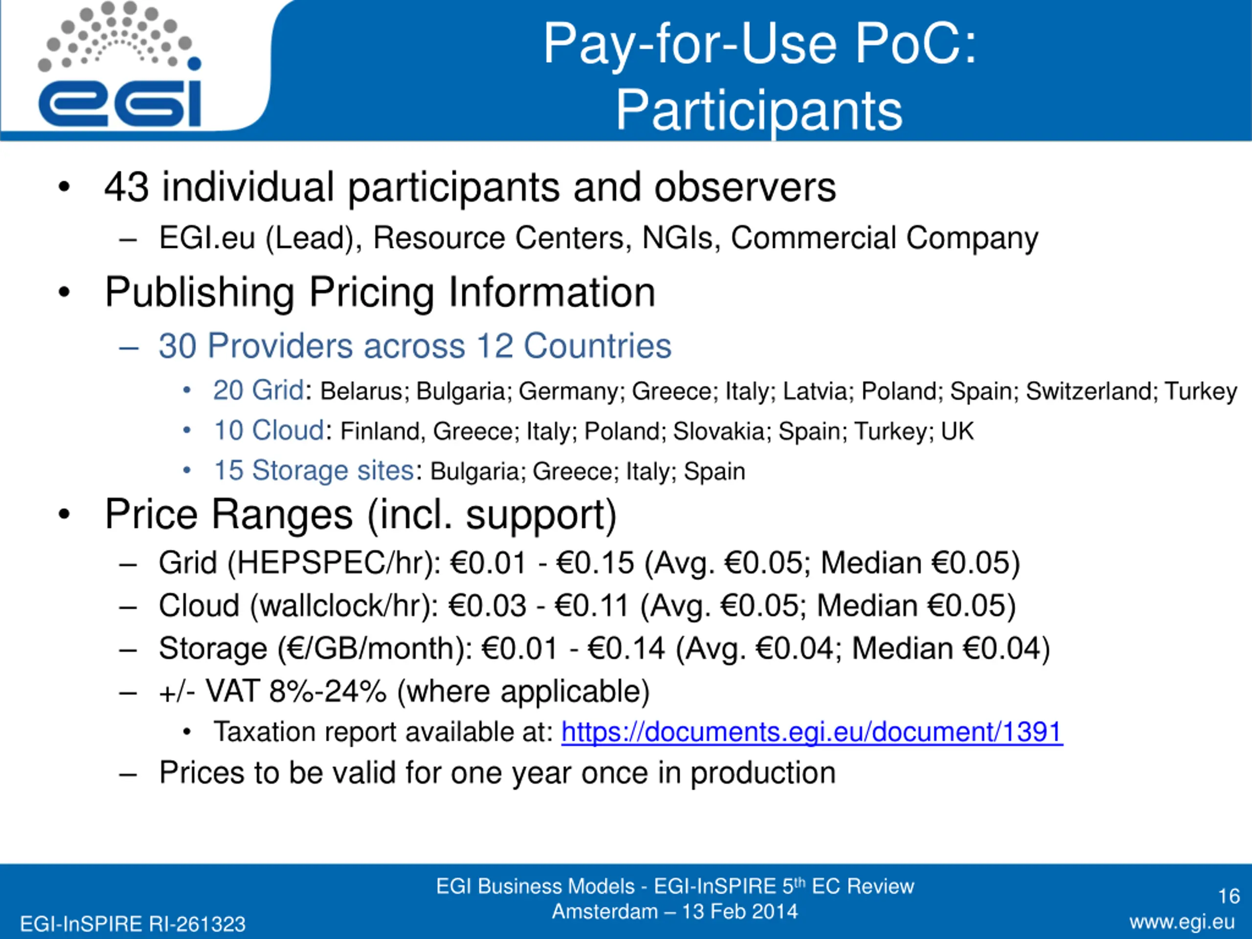 Pay-for-Use PoC: Participants 43 individual participants and observers EGI.eu (Lead), Resource Centers, NGIs, Commercial Company Publishing Pricing Information 30 Providers across 12 Countries 20 Grid: Belarus; Bulgaria; Germany; Greece; Italy; Latvia; Poland; Spain; Switzerland; Turkey 10 Cloud: Finland, Greece; Italy; Poland; Slovakia; Spain; Turkey; UK 15 Storage sites: Bulgaria; Greece; Italy; Spain Price Ranges (incl. support) Grid (HEPSPEC/hr): 0.01 - 0.15 (Avg. 0.05; Median 0.05) Cloud (wallclock/hr): 0.03 - 0.11 (Avg. 0.05; Median 0.05) Storage ( /GB/month): 0.01 - 0.14 (Avg. 0.04; Median 0.04) +/- VAT 8%-24% (where applicable) Taxation report available at: https://documents.egi.eu/document/1391 Prices to be valid for one year once in production EGI Business Models - EGI-InSPIRE 5th EC Review Amsterdam 13 Feb 2014 16 www.egi.eu EGI-InSPIRE RI-261323