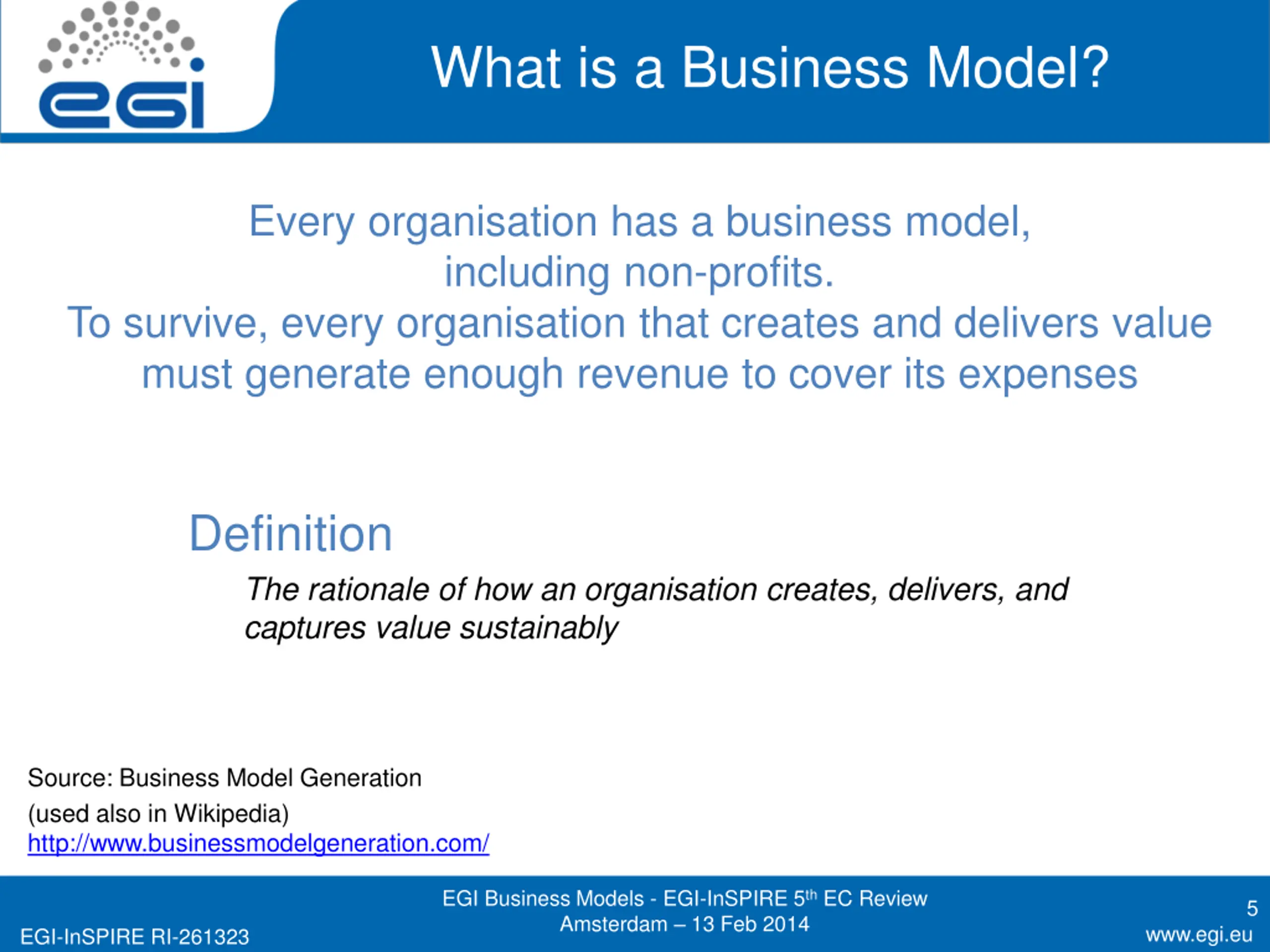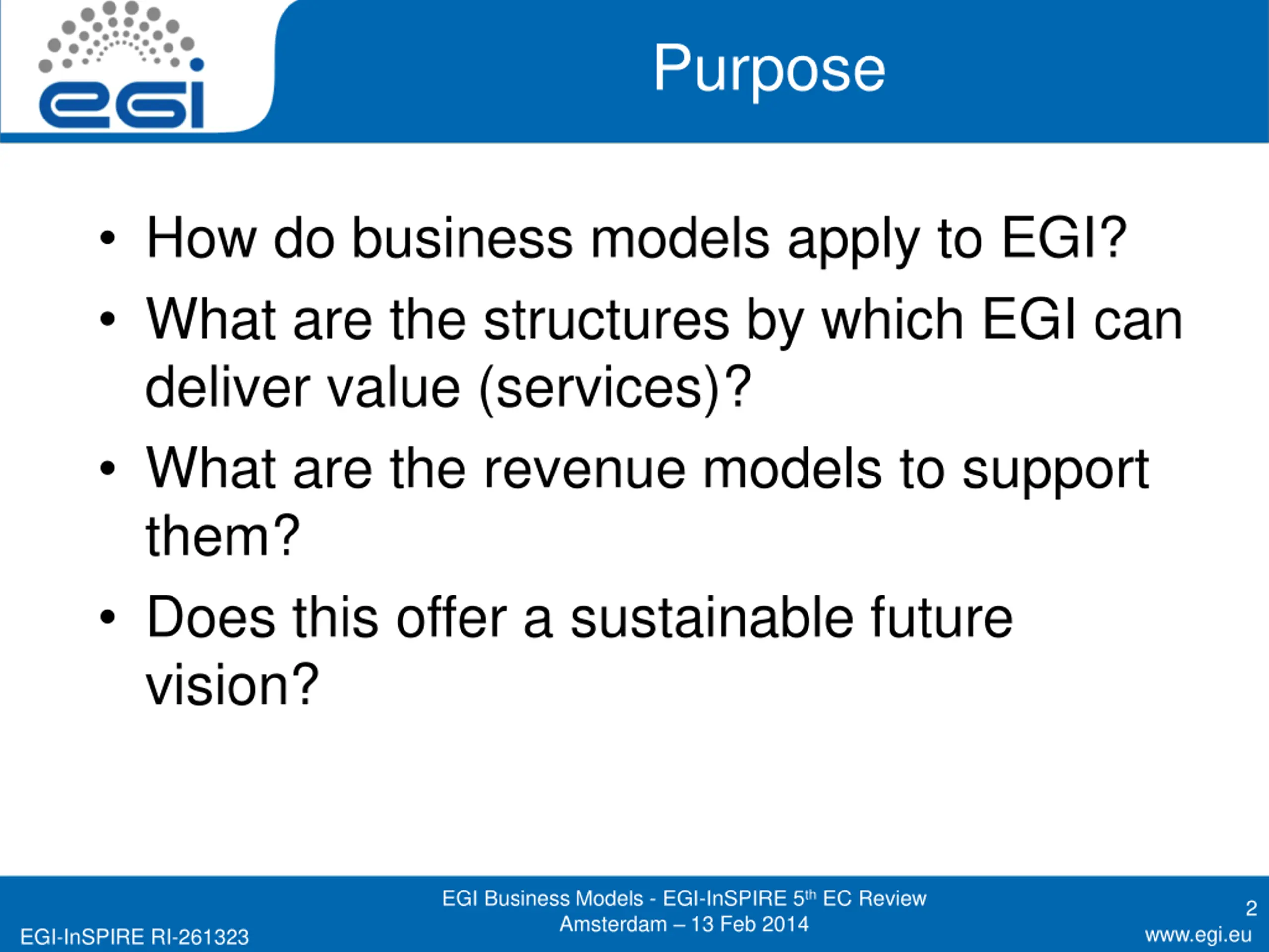 Purpose How do business models apply to EGI? What are the structures by which EGI can deliver value (services)? What are the revenue models to support them? Does this offer a sustainable future vision? EGI Business Models - EGI-InSPIRE 5th EC Review Amsterdam 13 Feb 2014 2 www.egi.eu EGI-InSPIRE RI-261323