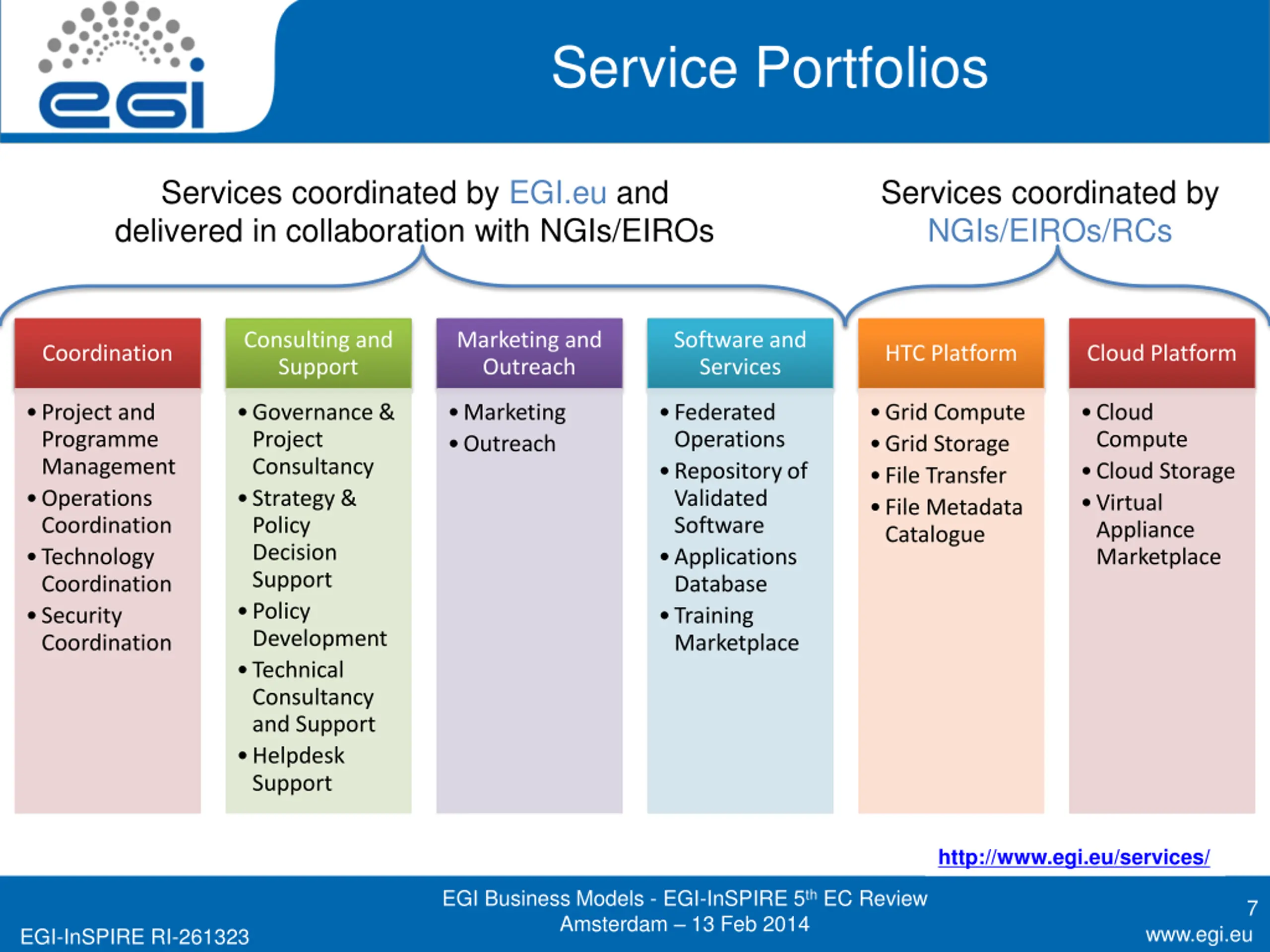 EGI Organisational Model Individual Researchers Research communities Research Infrastructures Industry Researcher-facing Services coordinated by NGIs/EIROs/RC EGI portfolio EGI.eu portfolio NGI 1 EGI.eu v Services coordinated by EGI.eu And delivered in collaboration with NGIs/EIROs EIRO 1 NGI 2 The EGI Federation EGI Business Models - EGI-InSPIRE 5th EC Review Amsterdam 13 Feb 2014 6 www.egi.eu EGI-InSPIRE RI-261323