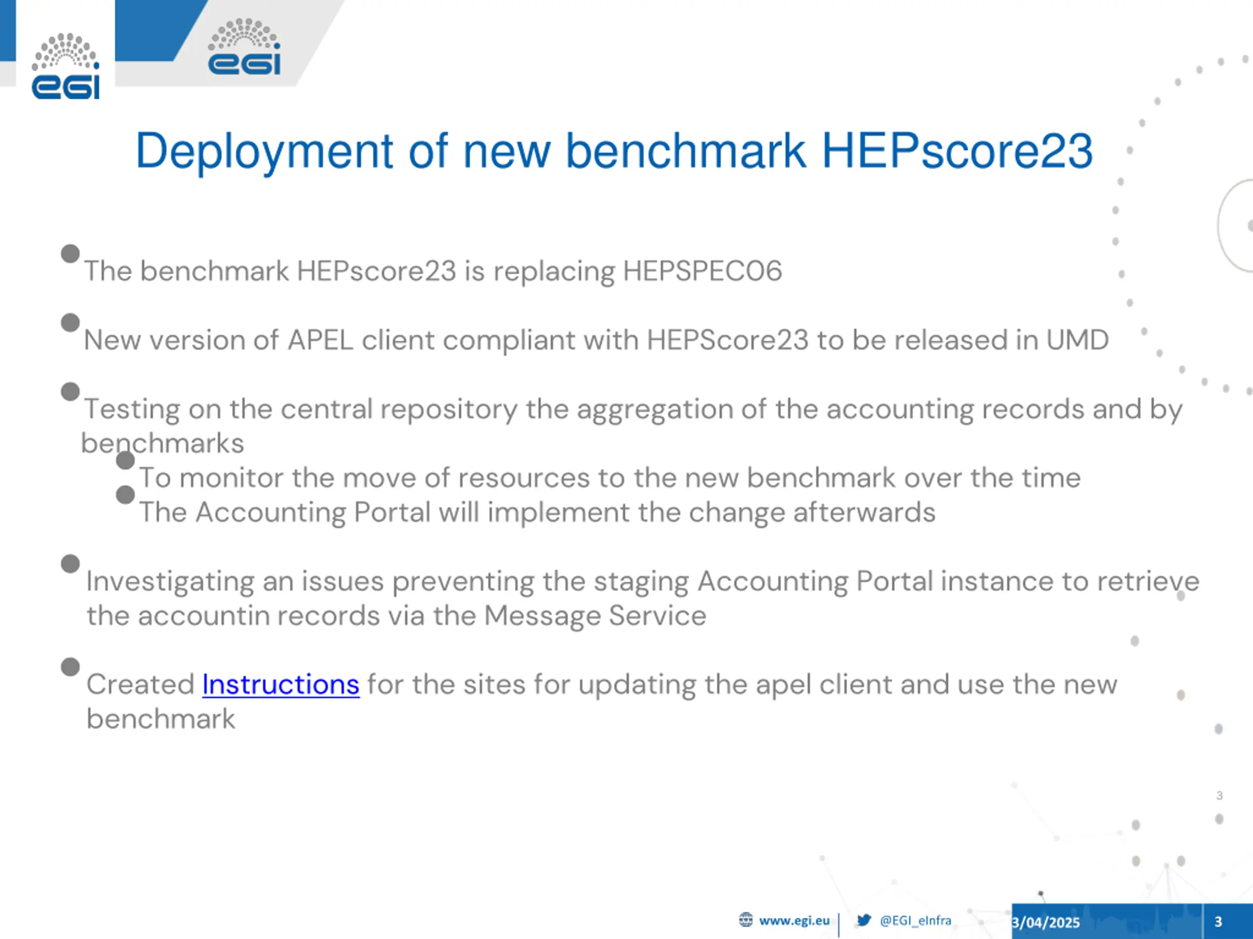 Deployment of new benchmark HEPscore23 The benchmark HEPscore23 is replacing HEPSPEC06 New version of APEL client compliant with HEPScore23 to be released in UMD Testing on the central repository the aggregation of the accounting records and by benchmarks To monitor the move of resources to the new benchmark over the time The Accounting Portal will implement the change afterwards Investigating an issues preventing the staging Accounting Portal instance to retrieve the accountin records via the Message Service Created Instructions for the sites for updating the apel client and use the new benchmark 3 www.egi.eu @EGI_eInfra 3 13/04/2025