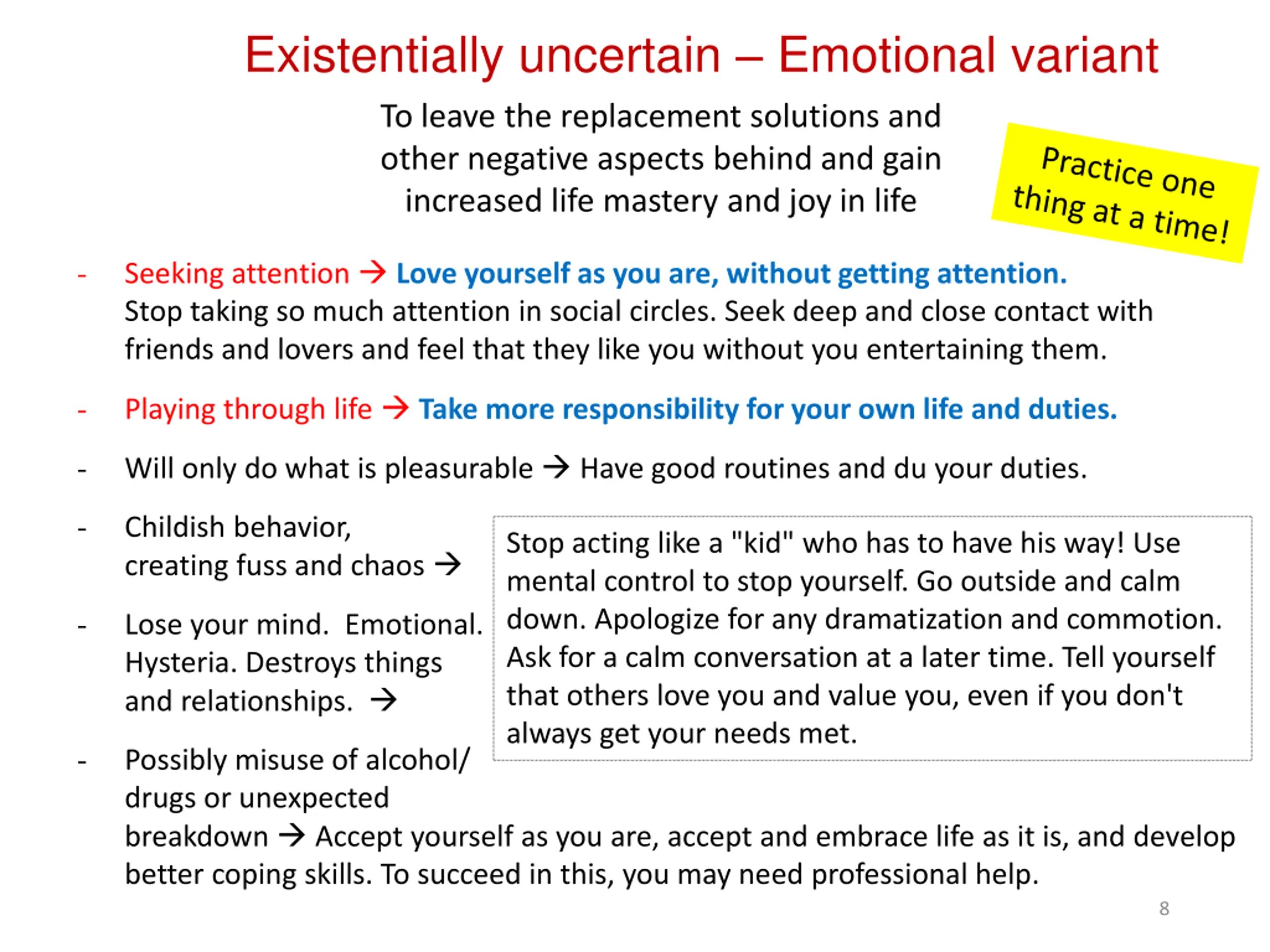 Existentially uncertain Emotional variant To leave the replacement solutions and other negative aspects behind and gain increased life mastery and joy in life - Seeking attention Love yourself as you are, without getting attention. Stop taking so much attention in social circles. Seek deep and close contact with friends and lovers and feel that they like you without you entertaining them. - Playing through life Take more responsibility for your own life and duties. - Will only do what is pleasurable Have good routines and du your duties. - Childish behavior, creating fuss and chaos Stop acting like a "kid" who has to have his way! Use mental control to stop yourself. Go outside and calm down. Apologize for any dramatization and commotion. Ask for a calm conversation at a later time. Tell yourself that others love you and value you, even if you don't always get your needs met. - Lose your mind. Emotional. Hysteria. Destroys things and relationships. - Possibly misuse of alcohol/ drugs or unexpected breakdown Accept yourself as you are, accept and embrace life as it is, and develop better coping skills. To succeed in this, you may need professional help. 8