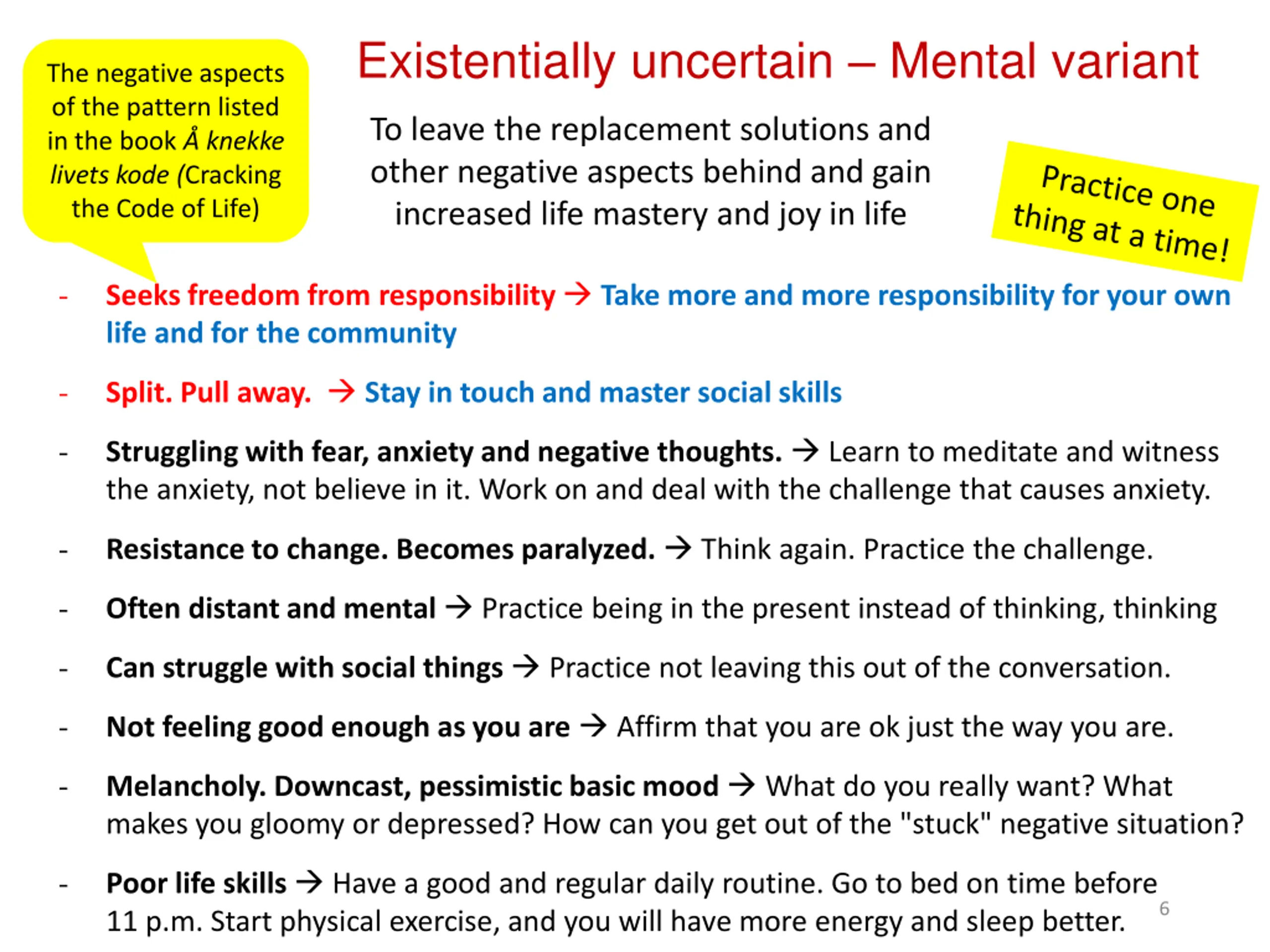 Existentially uncertain Mental variant The negative aspects of the pattern listed in the book knekke livets kode (Cracking the Code of Life) To leave the replacement solutions and other negative aspects behind and gain increased life mastery and joy in life - Seeks freedom from responsibility Take more and more responsibility for your own life and for the community - Split. Pull away. Stay in touch and master social skills - Struggling with fear, anxiety and negative thoughts. Learn to meditate and witness the anxiety, not believe in it. Work on and deal with the challenge that causes anxiety. - Resistance to change. Becomes paralyzed. Think again. Practice the challenge. - Often distant and mental Practice being in the present instead of thinking, thinking - Can struggle with social things Practice not leaving this out of the conversation. - Not feeling good enough as you are Affirm that you are ok just the way you are. - Melancholy. Downcast, pessimistic basic mood What do you really want? What makes you gloomy or depressed? How can you get out of the "stuck" negative situation? - Poor life skills Have a good and regular daily routine. Go to bed on time before 11 p.m. Start physical exercise, and you will have more energy and sleep better. 6