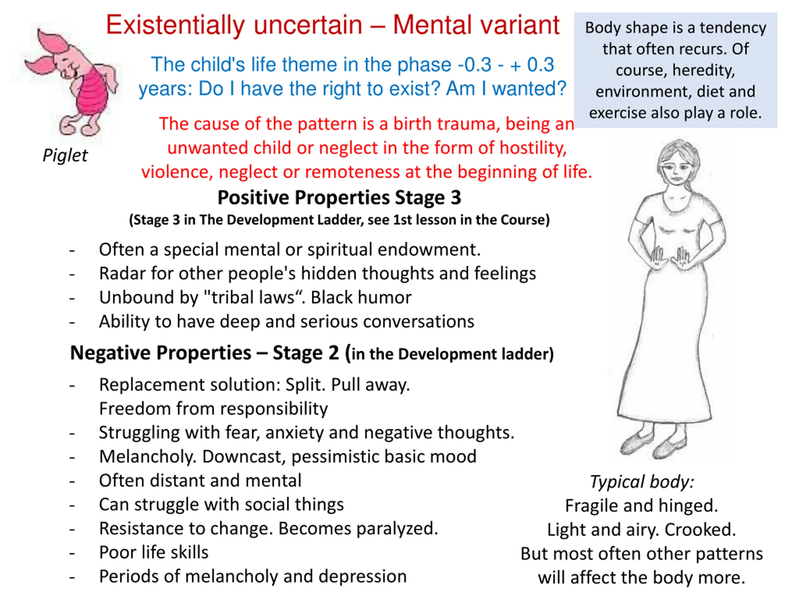 Existentially uncertain Mental variant Body shape is a tendency that often recurs. Of course, heredity, environment, diet and exercise also play a role. The child's life theme in the phase -0.3 - + 0.3 years: Do I have the right to exist? Am I wanted? The cause of the pattern is a birth trauma, being an unwanted child or neglect in the form of hostility, violence, neglect or remoteness at the beginning of life. Positive Properties Stage 3 (Stage 3 in The Development Ladder, see 1st lesson in the Course) Piglet - - - - Negative Properties Stage 2 (in the Development ladder) - Replacement solution: Split. Pull away. Freedom from responsibility - Struggling with fear, anxiety and negative thoughts. - Melancholy. Downcast, pessimistic basic mood - Often distant and mental - Can struggle with social things - Resistance to change. Becomes paralyzed. - Poor life skills - Periods of melancholy and depression Often a special mental or spiritual endowment. Radar for other people's hidden thoughts and feelings Unbound by "tribal laws . Black humor Ability to have deep and serious conversations Typical body: Fragile and hinged. Light and airy. Crooked. But most often other patterns will affect the body more.