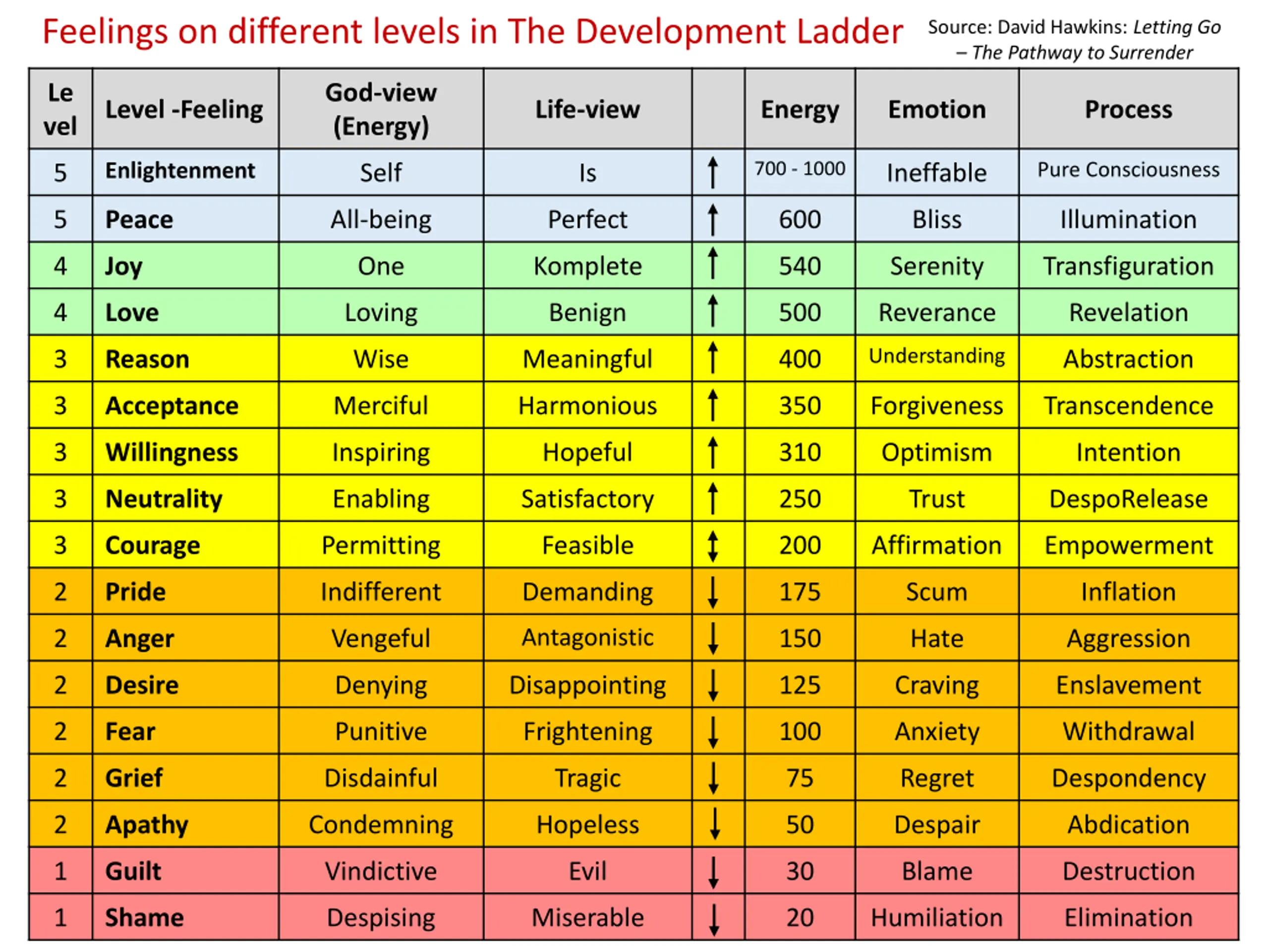 Feelings on different levels in The Development Ladder Source: David Hawkins: Letting Go The Pathway to Surrender Le vel God-view (Energy) Level -Feeling Life-view Energy Emotion Process 700 - 1000 Pure Consciousness Enlightenment 5 Self Is Ineffable 5 Peace All-being Perfect 600 Bliss Illumination 4 Joy One Komplete 540 Serenity Transfiguration 4 Love Loving Benign 500 Reverance Revelation Understanding 3 Reason Wise Meaningful 400 Abstraction 3 Acceptance Merciful Harmonious 350 Forgiveness Transcendence 3 Willingness Inspiring Hopeful 310 Optimism Intention 3 Neutrality Enabling Satisfactory 250 Trust DespoRelease 3 Courage Permitting Feasible 200 Affirmation Empowerment 2 Pride Indifferent Demanding 175 Scum Inflation Antagonistic 2 Anger Vengeful 150 Hate Aggression 2 Desire Denying Disappointing 125 Craving Enslavement 2 Fear Punitive Frightening 100 Anxiety Withdrawal 2 Grief Disdainful Tragic 75 Regret Despondency 2 Apathy Condemning Hopeless 50 Despair Abdication 1 Guilt Vindictive Evil 30 Blame Destruction 1 Shame Despising Miserable 20 Humiliation Elimination