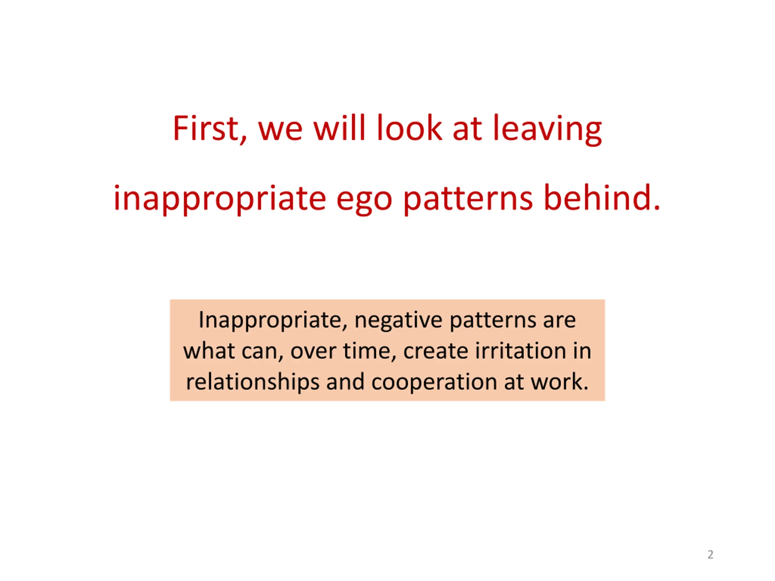 First, we will look at leaving inappropriate ego patterns behind. Inappropriate, negative patterns are what can, over time, create irritation in relationships and cooperation at work. 2