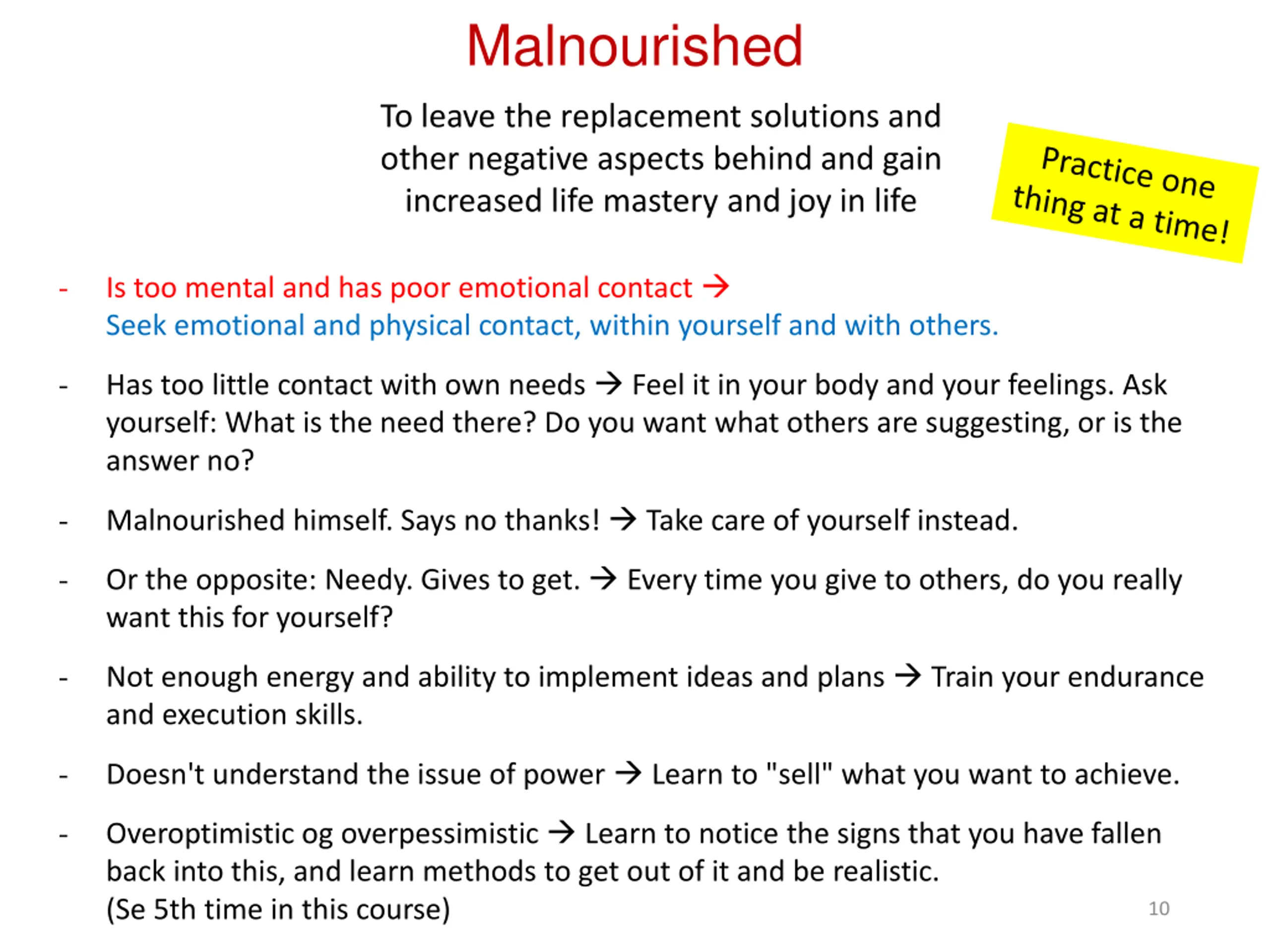 Malnourished To leave the replacement solutions and other negative aspects behind and gain increased life mastery and joy in life - Is too mental and has poor emotional contact Seek emotional and physical contact, within yourself and with others. - Has too little contact with own needs Feel it in your body and your feelings. Ask yourself: What is the need there? Do you want what others are suggesting, or is the answer no? - Malnourished himself. Says no thanks! Take care of yourself instead. - Or the opposite: Needy. Gives to get. Every time you give to others, do you really want this for yourself? - Not enough energy and ability to implement ideas and plans Train your endurance and execution skills. - Doesn't understand the issue of power Learn to "sell" what you want to achieve. - Overoptimistic og overpessimistic Learn to notice the signs that you have fallen back into this, and learn methods to get out of it and be realistic. (Se 5th time in this course) 10