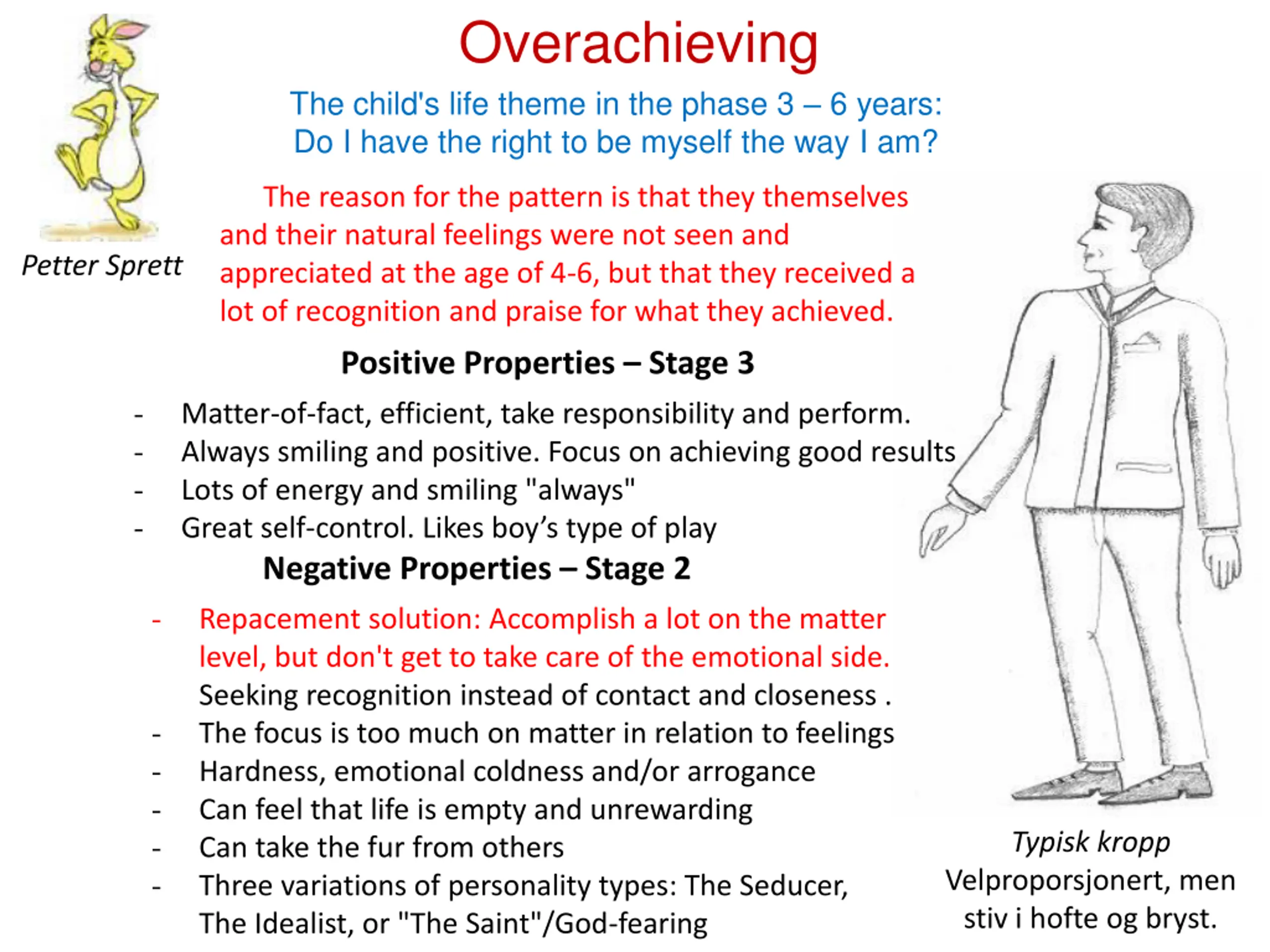 Overachieving The child's life theme in the phase 3 6 years: Do I have the right to be myself the way I am? The reason for the pattern is that they themselves and their natural feelings were not seen and appreciated at the age of 4-6, but that they received a lot of recognition and praise for what they achieved. Petter Sprett Positive Properties Stage 3 - - - - Matter-of-fact, efficient, take responsibility and perform. Always smiling and positive. Focus on achieving good results Lots of energy and smiling "always" Great self-control. Likes boy s type of play Negative Properties Stage 2 - Repacement solution: Accomplish a lot on the matter level, but don't get to take care of the emotional side. Seeking recognition instead of contact and closeness . The focus is too much on matter in relation to feelings Hardness, emotional coldness and/or arrogance Can feel that life is empty and unrewarding Can take the fur from others Three variations of personality types: The Seducer, The Idealist, or "The Saint"/God-fearing - - - - - Typisk kropp Velproporsjonert, men stiv i hofte og bryst.