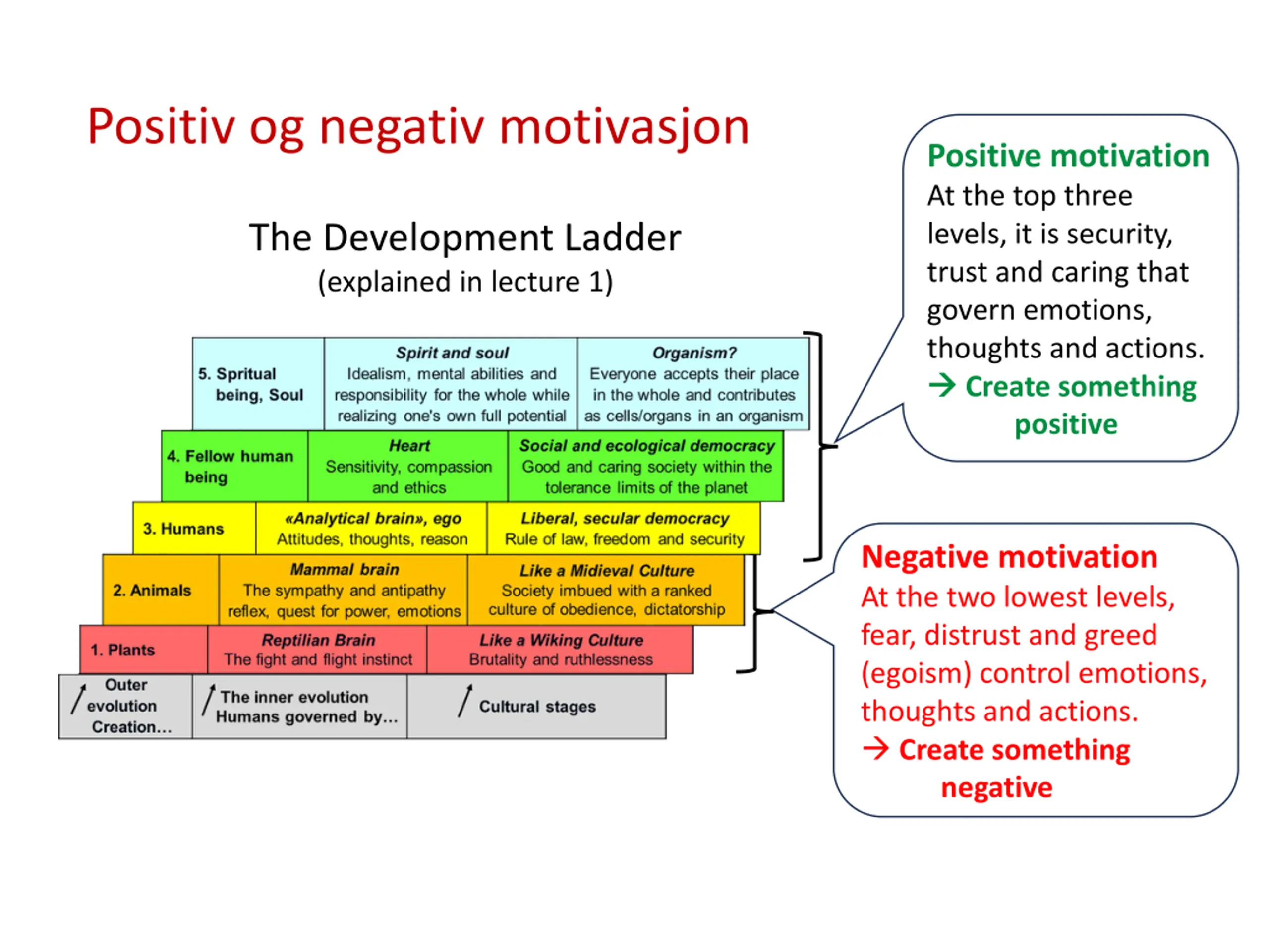 Positiv og negativ motivasjon Positive motivation At the top three levels, it is security, trust and caring that govern emotions, thoughts and actions. Create something positive The Development Ladder (explained in lecture 1) Negative motivation At the two lowest levels, fear, distrust and greed (egoism) control emotions, thoughts and actions. Create something negative