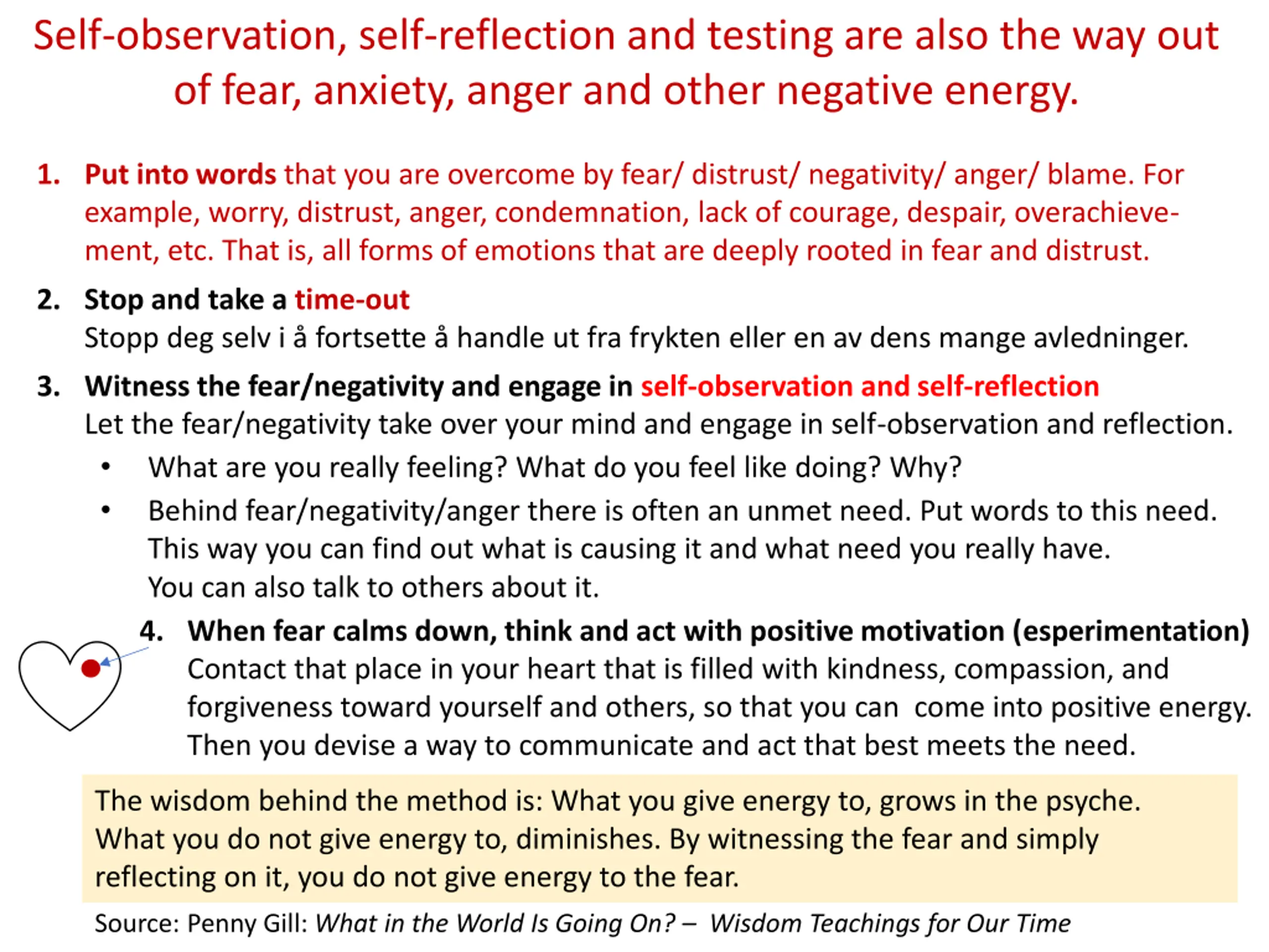 Self-observation, self-reflection and testing are also the way out of fear, anxiety, anger and other negative energy. 1. Put into words that you are overcome by fear/ distrust/ negativity/ anger/ blame. For example, worry, distrust, anger, condemnation, lack of courage, despair, overachieve- ment, etc. That is, all forms of emotions that are deeply rooted in fear and distrust. 2. Stop and take a time-out Stopp deg selv i fortsette handle ut fra frykten eller en av dens mange avledninger. 3. Witness the fear/negativity and engage in self-observation and self-reflection Let the fear/negativity take over your mind and engage in self-observation and reflection. What are you really feeling? What do you feel like doing? Why? Behind fear/negativity/anger there is often an unmet need. Put words to this need. This way you can find out what is causing it and what need you really have. You can also talk to others about it. 4. When fear calms down, think and act with positive motivation (esperimentation) Contact that place in your heart that is filled with kindness, compassion, and forgiveness toward yourself and others, so that you can come into positive energy. Then you devise a way to communicate and act that best meets the need. The wisdom behind the method is: What you give energy to, grows in the psyche. What you do not give energy to, diminishes. By witnessing the fear and simply reflecting on it, you do not give energy to the fear. Source: Penny Gill: What in the World Is Going On? Wisdom Teachings for Our Time