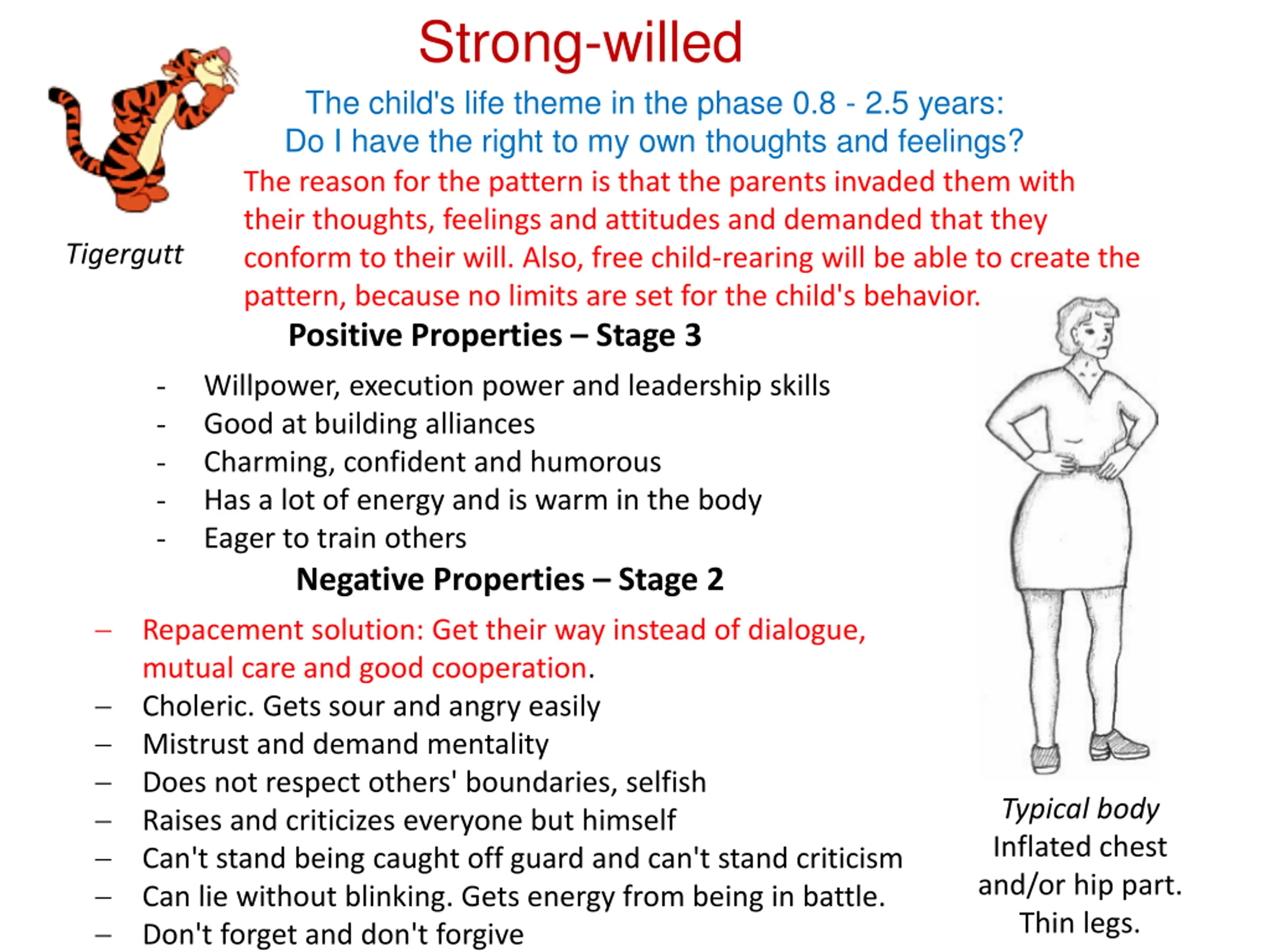 Strong-willed The child's life theme in the phase 0.8 - 2.5 years: Do I have the right to my own thoughts and feelings? The reason for the pattern is that the parents invaded them with their thoughts, feelings and attitudes and demanded that they conform to their will. Also, free child-rearing will be able to create the pattern, because no limits are set for the child's behavior. Positive Properties Stage 3 Tigergutt - - - - - Willpower, execution power and leadership skills Good at building alliances Charming, confident and humorous Has a lot of energy and is warm in the body Eager to train others Negative Properties Stage 2 Repacement solution: Get their way instead of dialogue, mutual care and good cooperation. Choleric. Gets sour and angry easily Mistrust and demand mentality Does not respect others' boundaries, selfish Raises and criticizes everyone but himself Can't stand being caught off guard and can't stand criticism Can lie without blinking. Gets energy from being in battle. Don't forget and don't forgive Typical body Inflated chest and/or hip part. Thin legs.